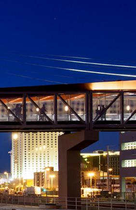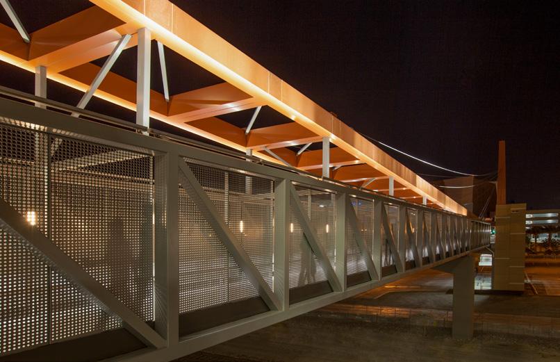 Creating a pedestrian bridge that traverses a busy area of downtown Las Vegas, Arktura manufactured custom perforated panels to run the length of the pass and more— to connect the Smith Center for the Performing Arts to the rest of the area’s premier developments, Symphony Park. The project utilizes Graphic Perf® to create precise cutouts that act as a windbreak and shade for pedestrians to safely walk across 150 feet above the active rail lines below. The walkway is flanked on either side by elevators and winding staircases, also clad in the Graphic Perf® panels. The subtle gradient of the perforations allows a clear view of the scenery around the project.