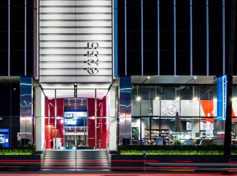 The exterior features multiple panels installed by Reliant Drywall, creating a bright, modern facade surrounding the building’s signature “1900” landmark signage which required additional detailing and engineering. This dazzling pattern is also seen in various, smaller waypoint-finding markers on the property leading to the building’s main entrance.