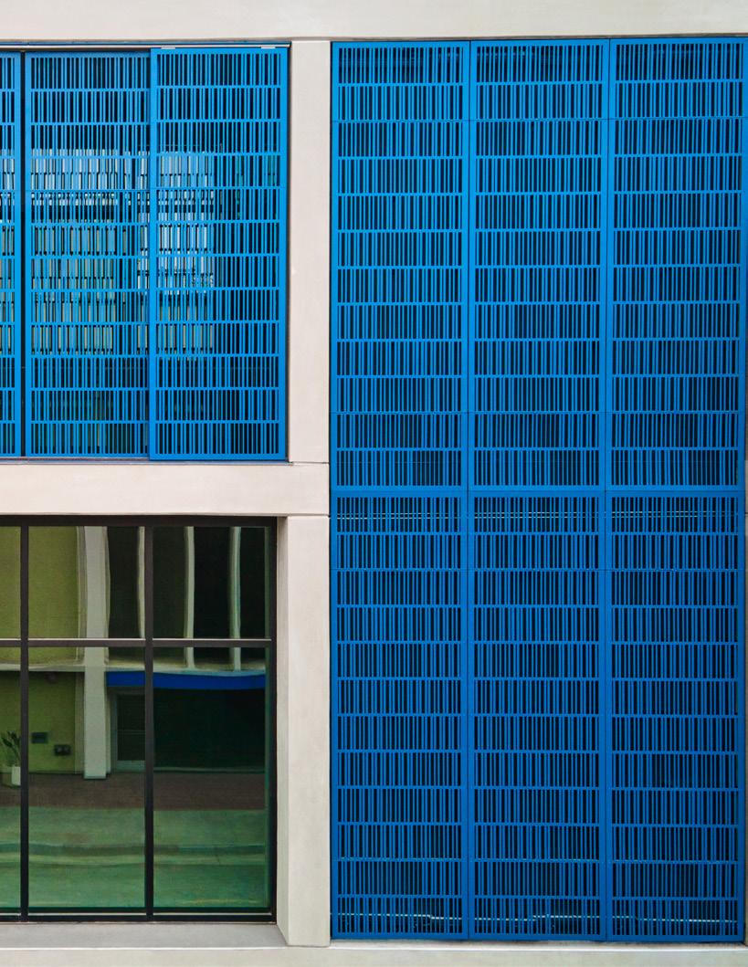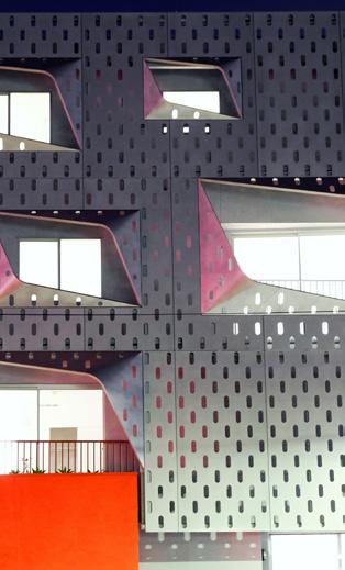 The project features a series of fully custom-made rolling metal panels spanning both the facade of the building and the open-air balconies. Some panels are set while others are mechanized, allowing range of motion. This movement is a key feature as it enables the finely crafted panels to protect against the glare of the ever-moving sun, helping control the internal temperature of the building.
