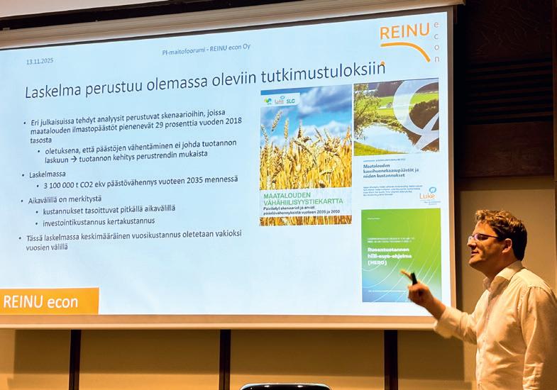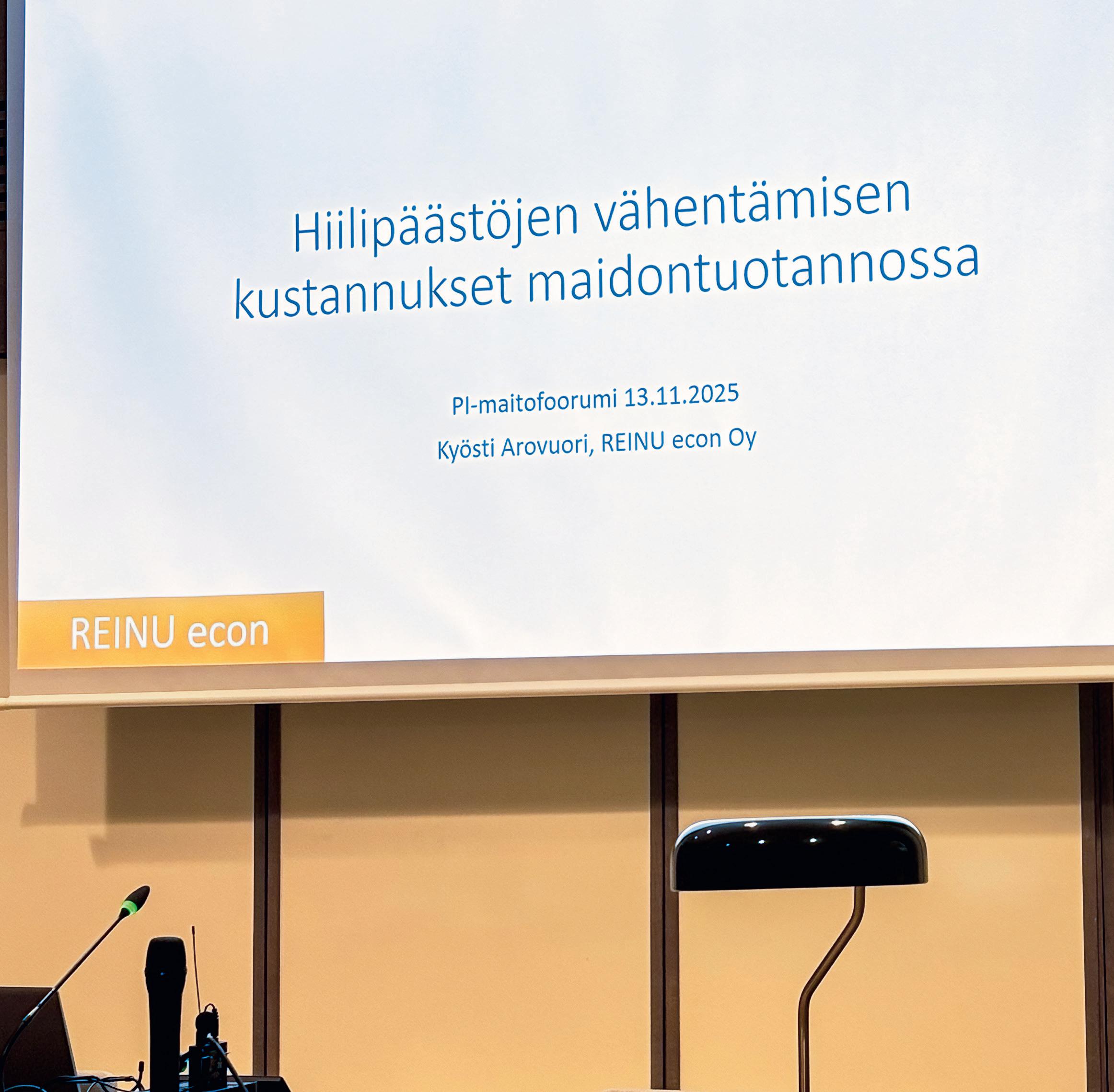 -maitofoorumi kokosi asiantuntijat keskustelemaan hiilipäästöjen vähentämisen kustannuksista maidontuotannossa marraskuussa Vantaalla. REINU Econ Oy:n esityksessä tohtori Kyösti Arovuori korosti, että päästöjen kustannuksista on olemassa