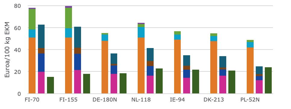 Suomen suurempi 155 lehmän tyyppitila ylsi nyt hieman parempaan tulokseen kuin keskiarvoa edustava 70 lehmän tila, hieman pienempien tuotantokustannusten ja toisaalta myös hieman vahvemman tulopuolen kautta.