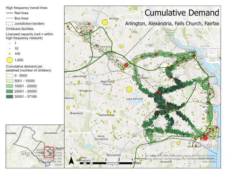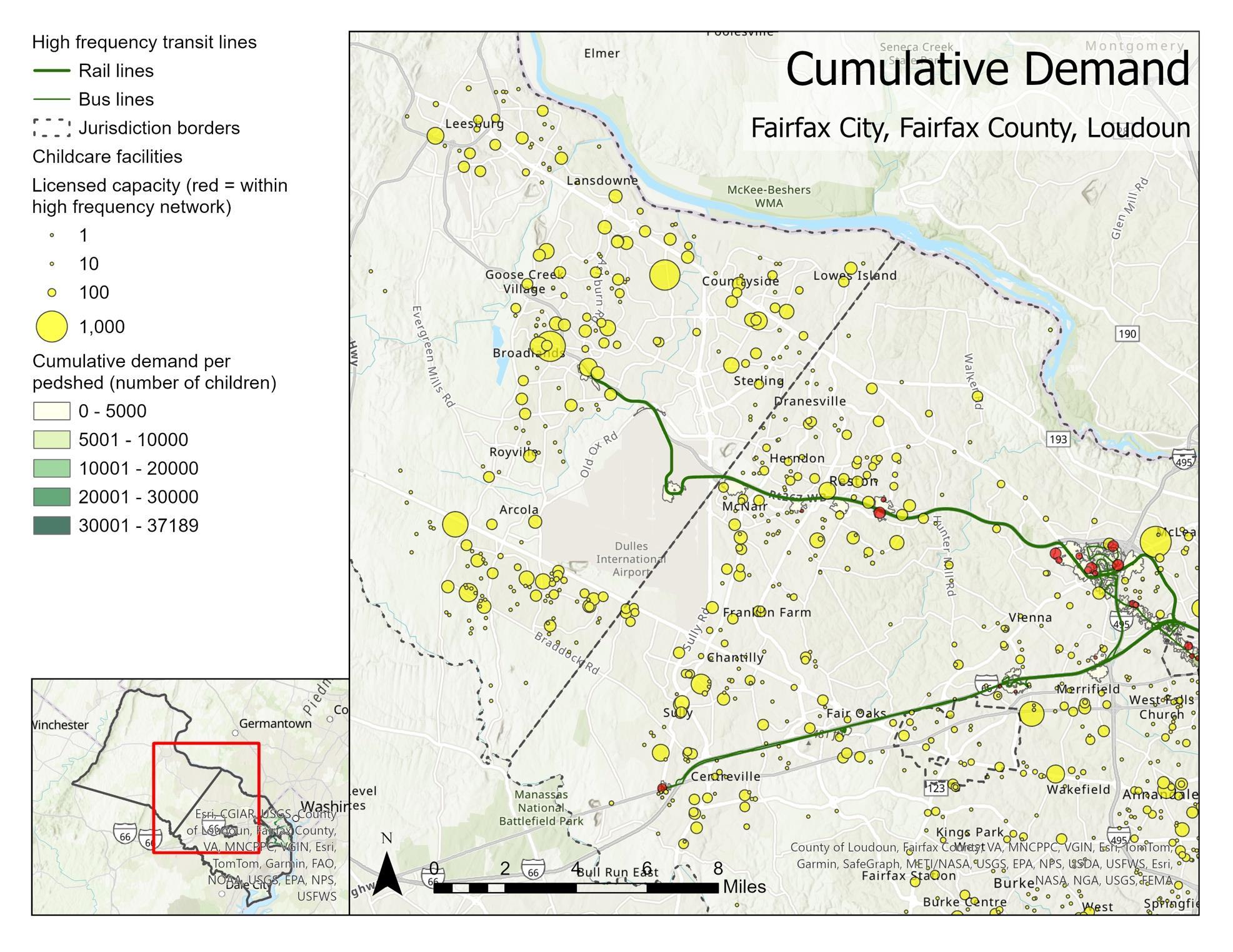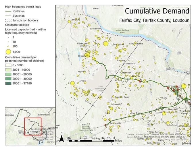 The cumulative demand analysis further underscores this gap. Children living near the end of transit lines, such as in Centreville or past Dulles Airport, are unlikely to reach a childcare provider via high-frequency transit within a reasonable timeframe, even when facilities exist nearby.