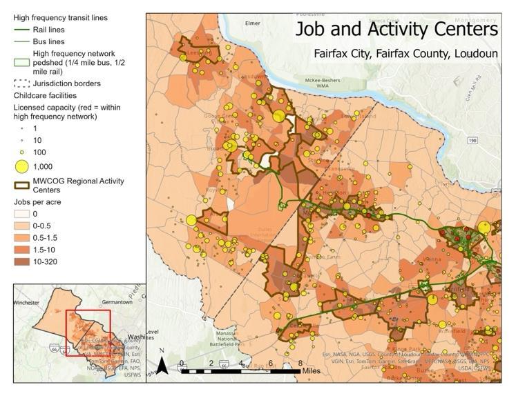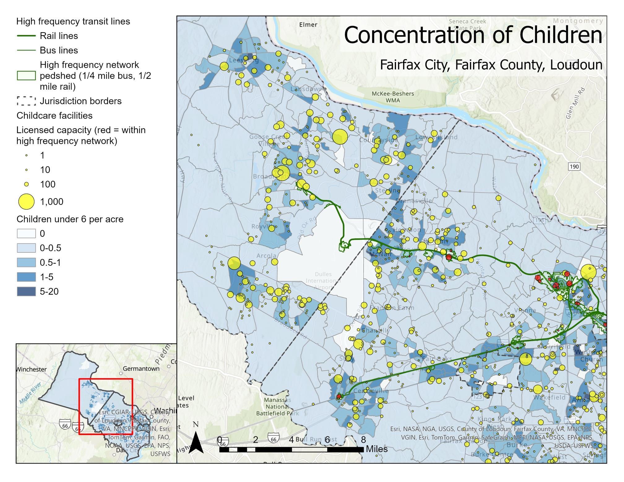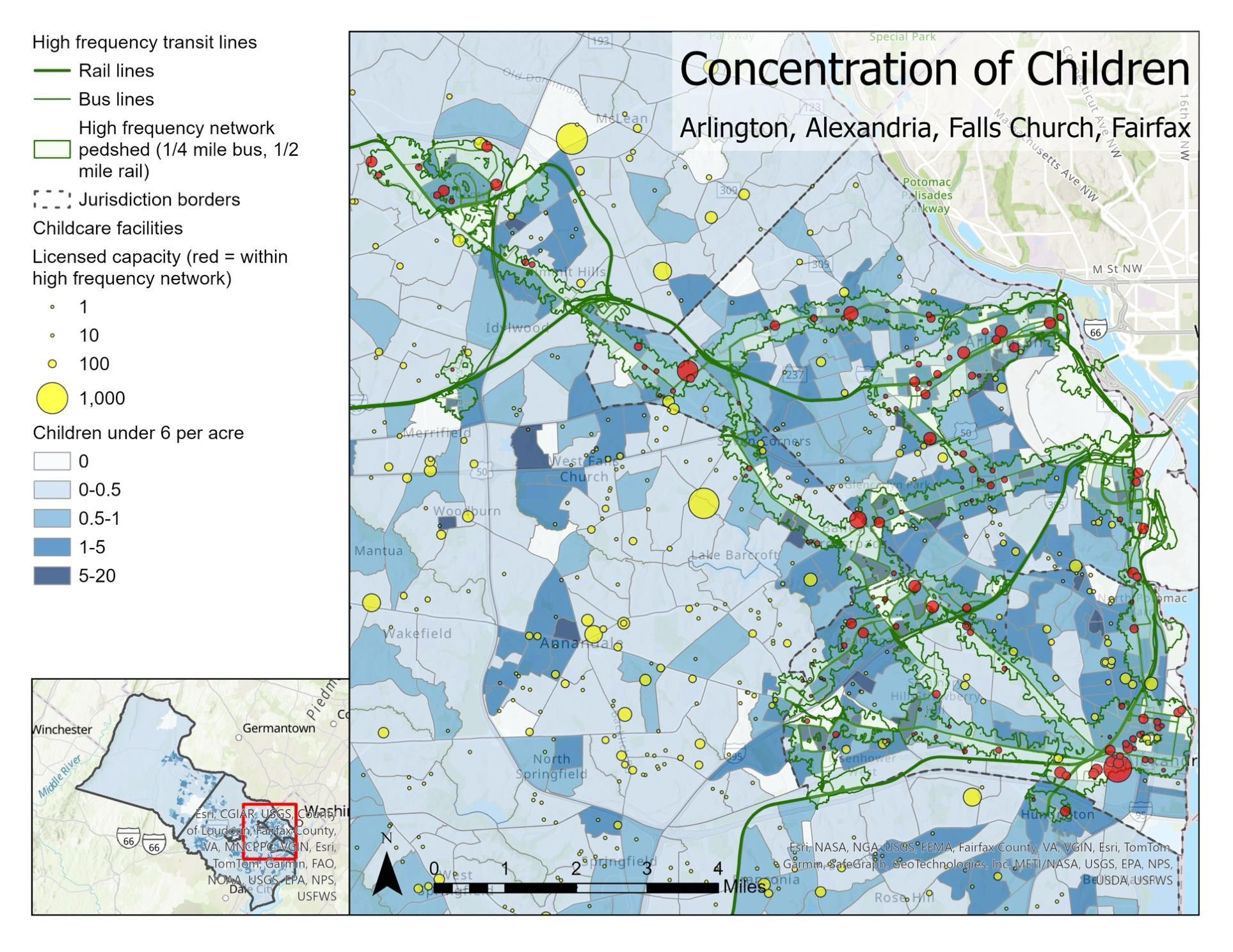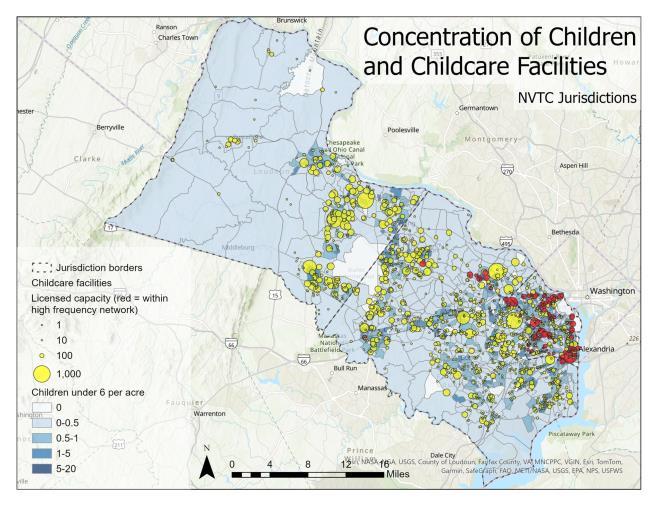 Map 1A illustrates the high-frequency transit network, the locations of childcare facilities, and the distribution of children under six across the NVTC jurisdictions. This data reveals three key trends: