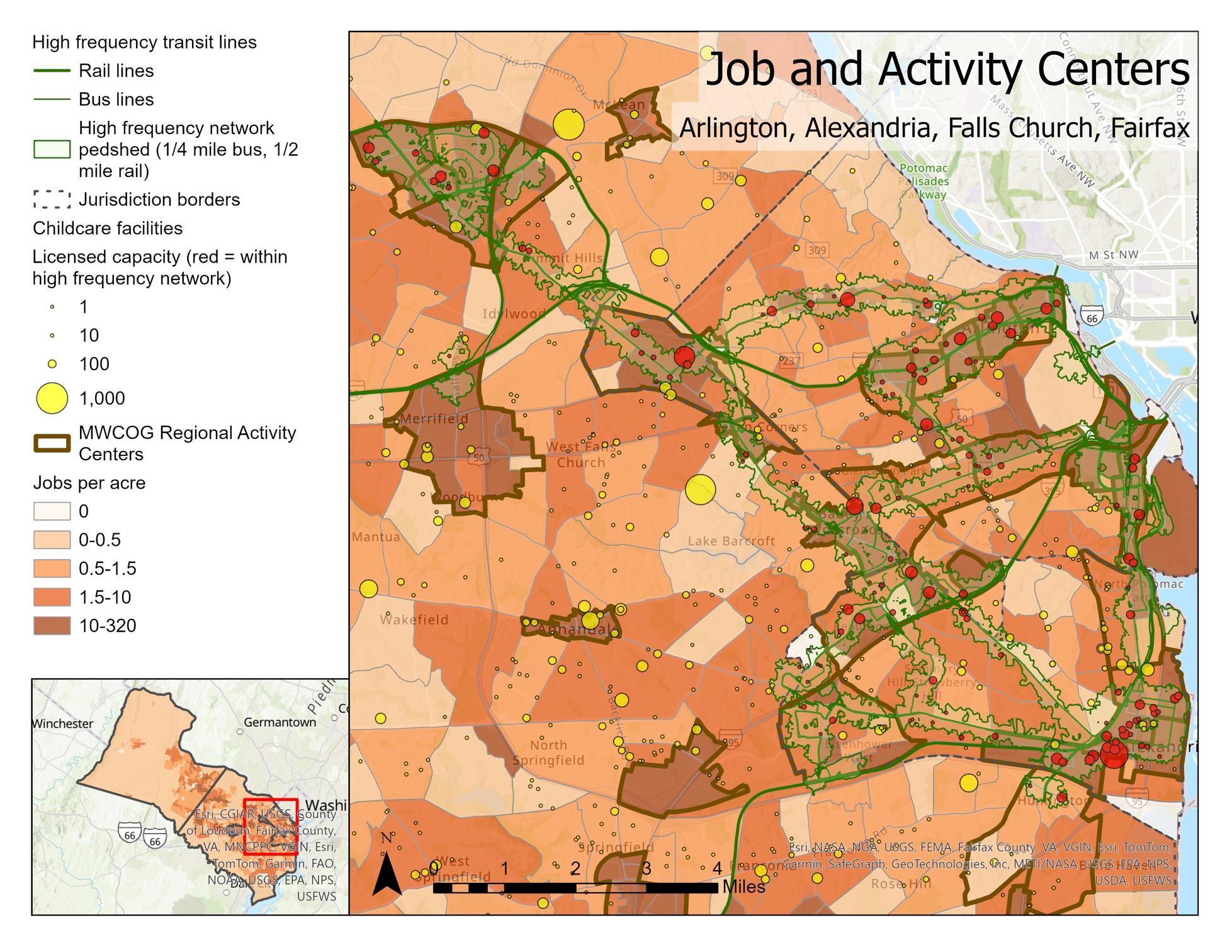 Proximity to job and activity centers can also influence childcare accessibility. Map C shows many dense job centers in the central core, especially in Arlington County and certain parts of Alexandria, such as Old Town and Eisenhower Avenue. As discussed above, these areas benefit from high-frequency transit services and have many existing childcare facilities.