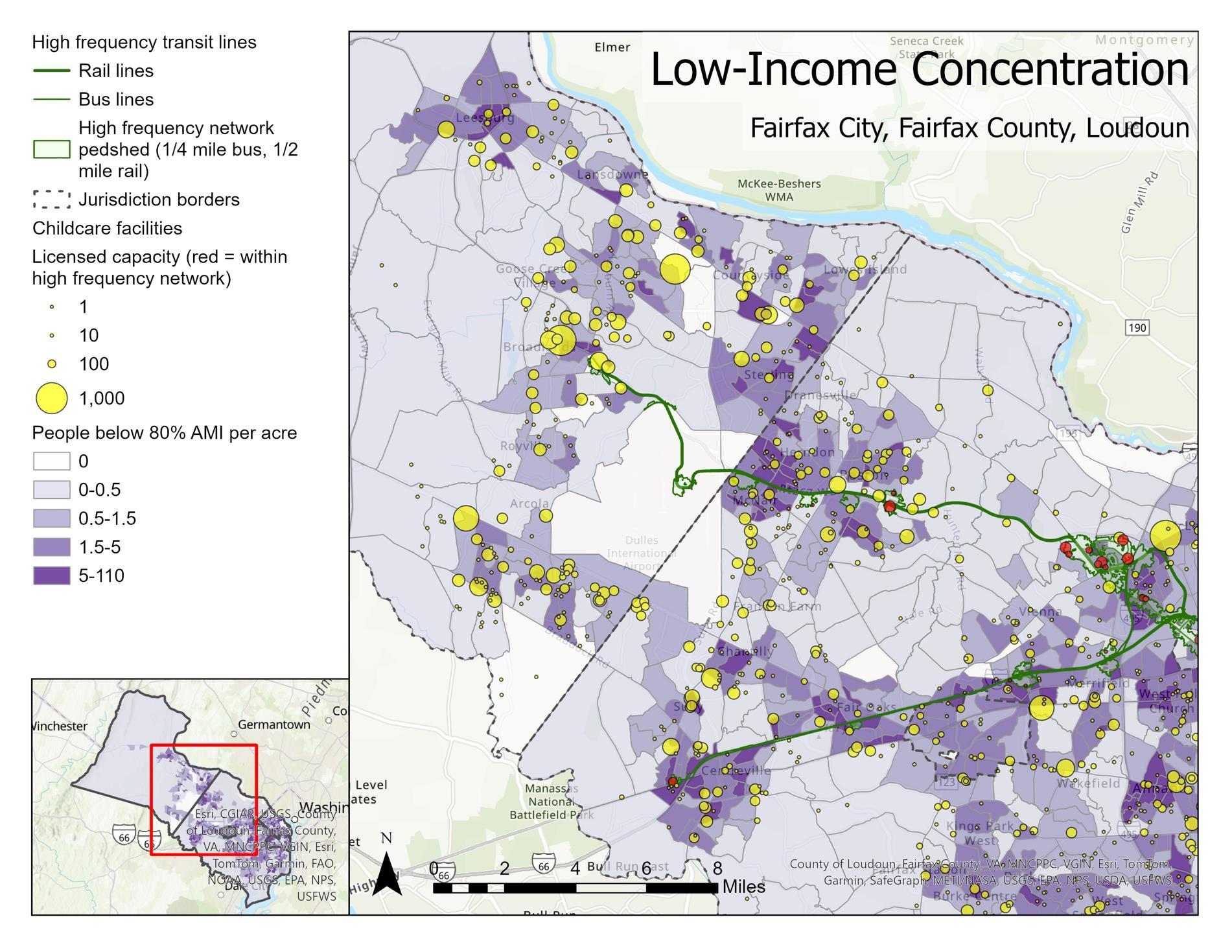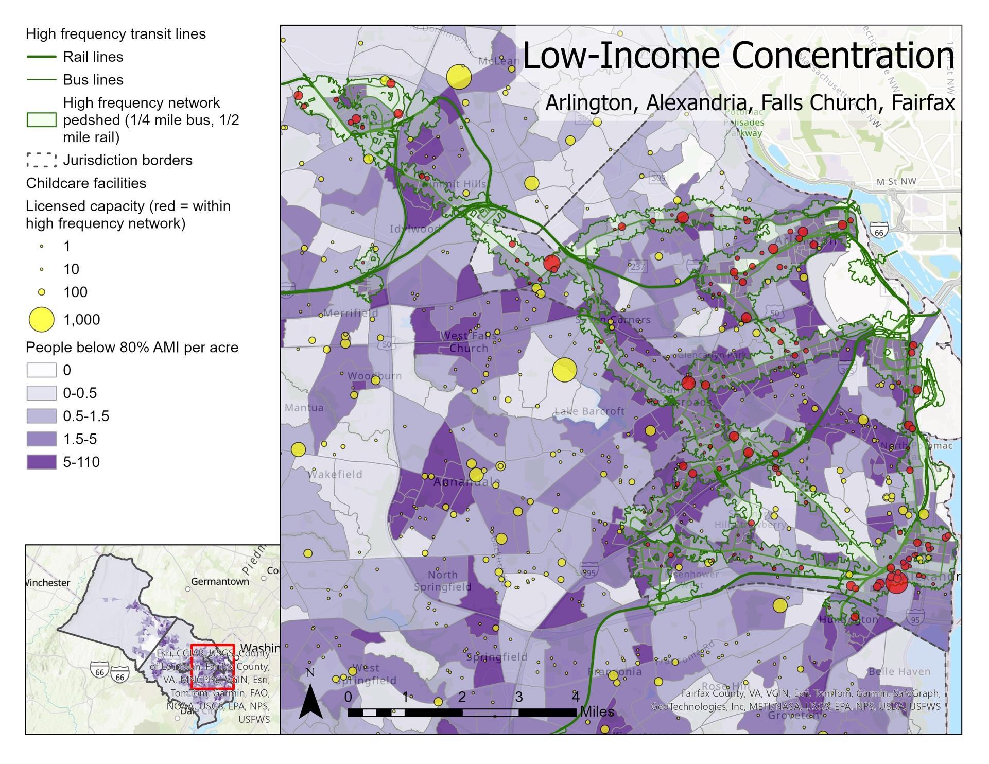Low-income populations are concentrated around the Beltway and Annandale, areas that lack high-frequency transit options despite having many high densities of children under six and jobs. Additionally, many low-income residents live within an easy pedestrian distance of these transit stops. The lack of additional high-frequency transit routes nearby may limit access to childcare facilities outside these immediate areas.