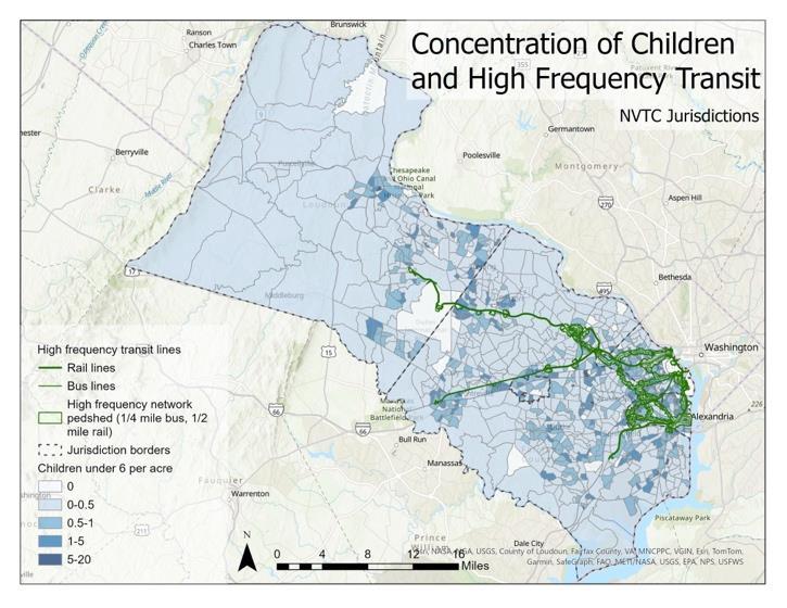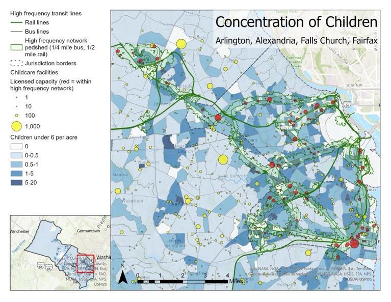 • Third, high-frequency transit services are primarily available in Arlington County and the City of Alexandria, with some coverage in the City of Falls Church and portions of Fairfax County, particularly along corridors leading to Dulles Airport and Centreville. However, many areas in the region, including those with a high concentration of children under six and a high volume of childcare facilities, lack access to high-frequency transit.