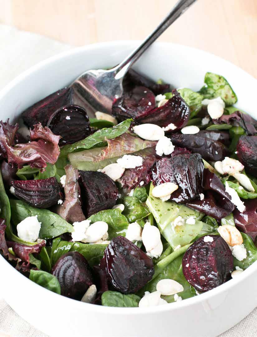In a large bowl, combine roasted beets, greens, pumpkin seeds, and goat cheese.