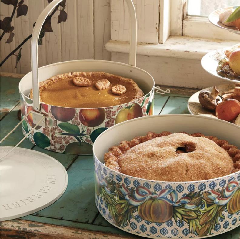 The Fruit & Gourds Fall Metal 11-Inch Pie Transporter from John Derian for Target lets you take your favorite pies over the river and through the woods in style. Two separate containers stack for holding two pies, and they can also be used for displaying the pies until it’s time to eat. Featuring a tinplate design with colorful fruit and gourd illustrations, this pie transporter also has a handle and lid for ease of carrying.