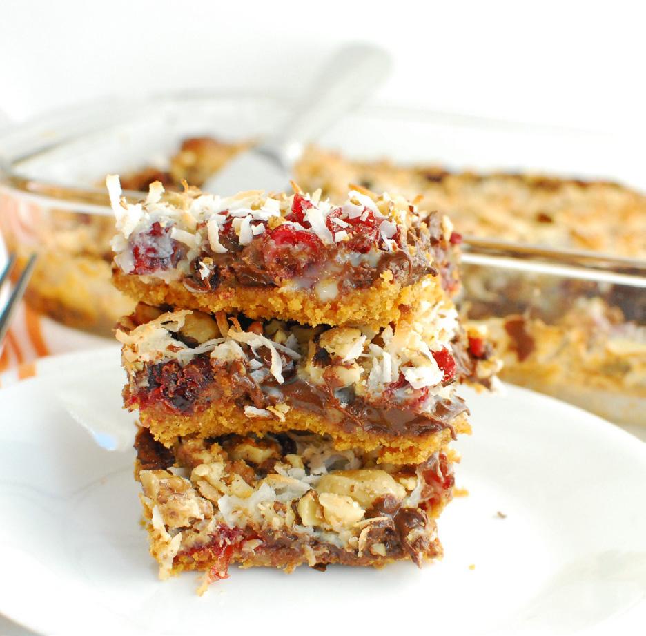 Sprinkle graham cracker crumbs over melted butter, then pour condensed milk evenly over the graham cracker crumbs. Top with remaining ingredients and press down firmly. Bake 25 minutes, cool, and cut into bars. Store in an airtight covered container at room temperature. Recipe: UsCranberries.com