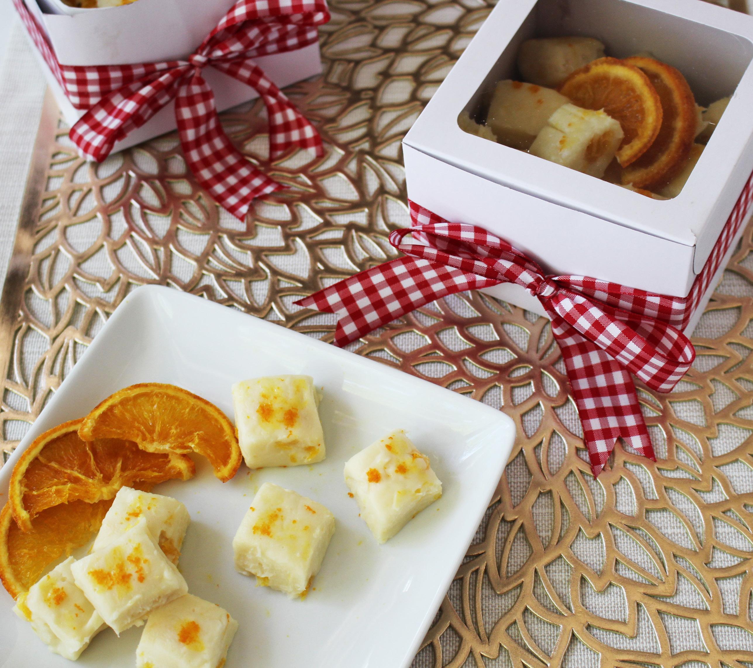 INGREDIENTS: 2 bags white chocolate chips | 1 can sweetened condensed milk | 1 Tbsp. orange extract | 1 oz. bourbon | ½ cup candied orange, chopped | 2 Tbsp. orange zest, for garnish Candied Orange Ingredients: 1 navel orange, peeled (see tips & tricks) | ½ cup sugar | ½ cup water