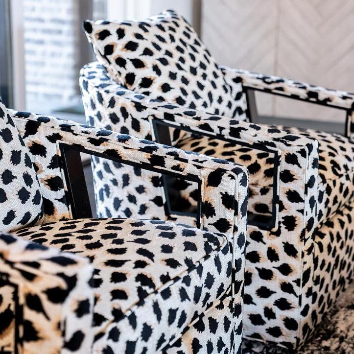 The home on this page was a complete remodel, so designing the kitchen in a black and white palette allowed us to pull in blue hues for the client’s sofa. We also used fun patterned chairs to add interest to the layout.
