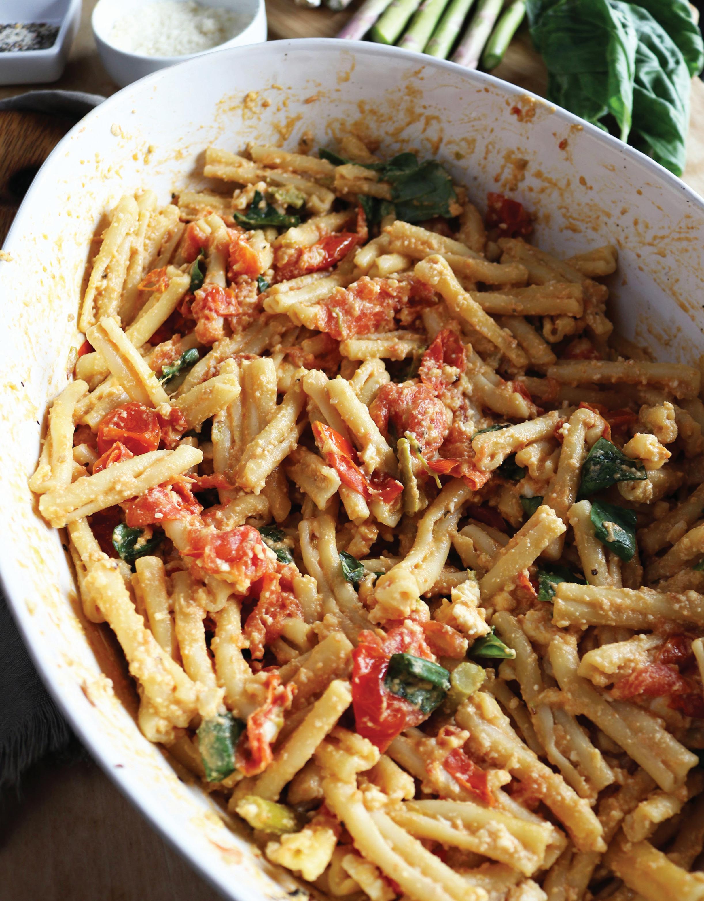 INGREDIENTS: 16 oz. cherry tomatoes | 1 cup asparagus, diced | 2 Tbsp. minced garlic | 4 Tbsp. olive oil | 1 tsp. salt | ½ tsp. pepper | ½ tsp. red pepper flake | ½ tsp. onion powder | 8 oz. block feta cheese | 4 to 5 cups cooked pasta of your choice | Fresh basil | Parmesan cheese