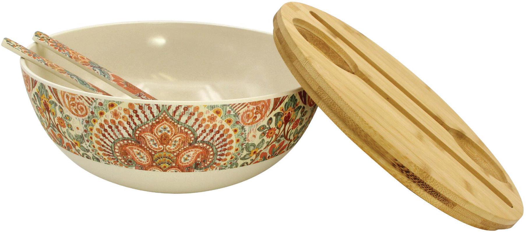 Exclusively at World Market, this Paisley Bamboo Fiber Serving Bowl and Salad Servers Set is crafted of bamboo fiber and melamine with a multicolor paisley design. The serving bowl includes two salad servers that store in the rustic lid. This space-saving set is perfect for preparing, tossing, and serving a full salad or side. Storing leftovers is simple. Just top it with the natural bamboo and pop it in the fridge.