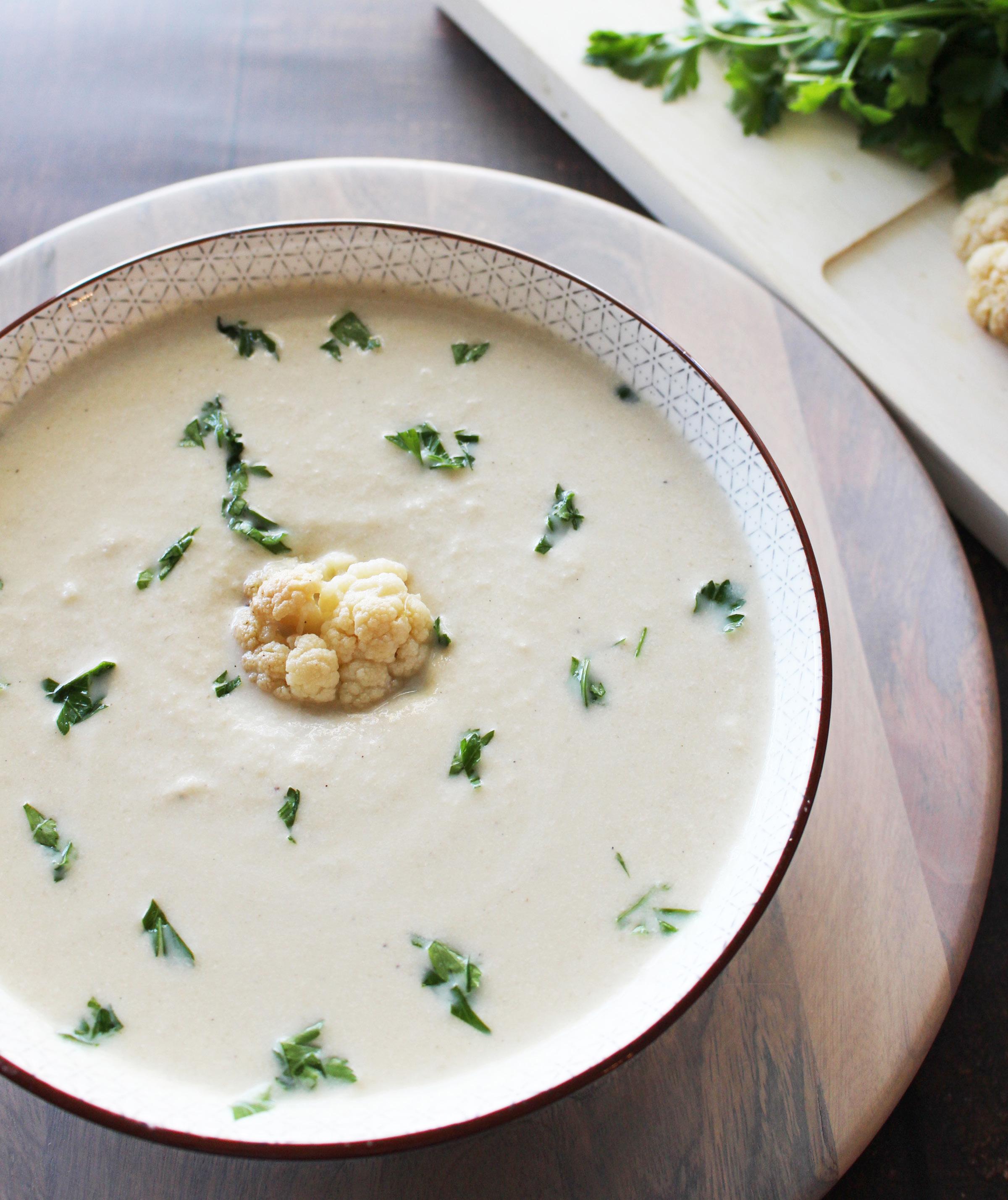 TIPS & TRICKS: You can place the onion, garlic, and cauliflower in a regular blender (if you don’t have an immersion blender) and add stock. Blend until smooth. Then return the mixture to the stockpot on the stove and follow the remaining directions.