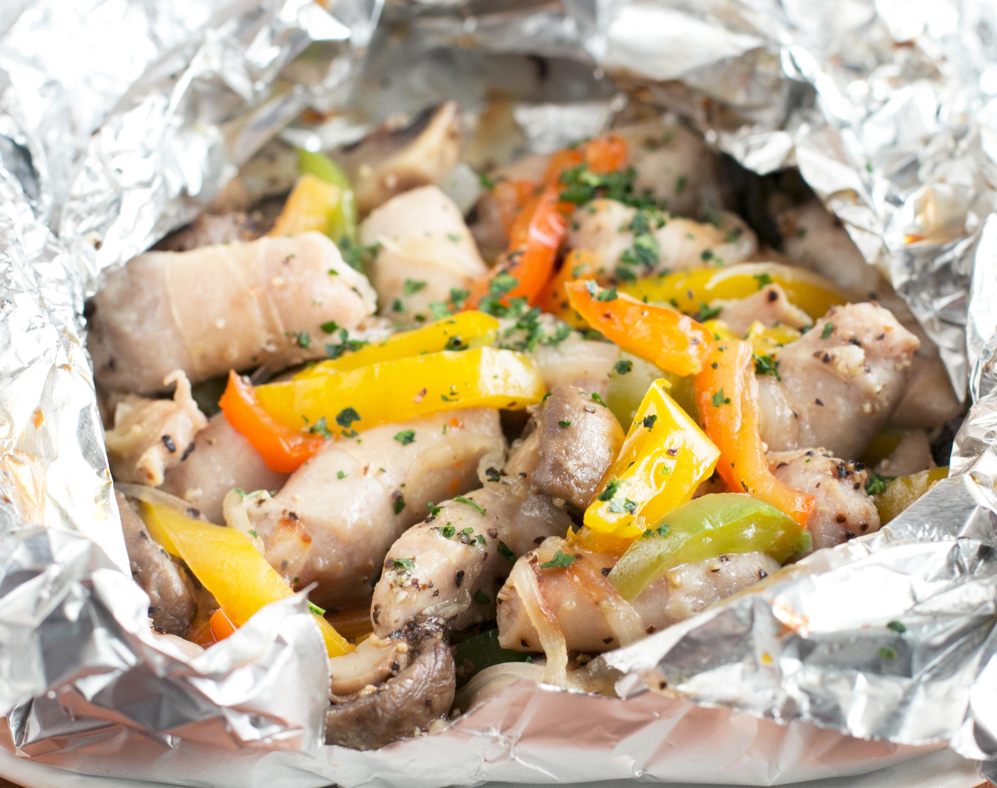 Cut four sheets of aluminum foil, approximately 18 inches long each. Evenly divide the sausage and vegetable mixture between the four pieces. Fold up the sides of each piece of aluminum foil to create packets.