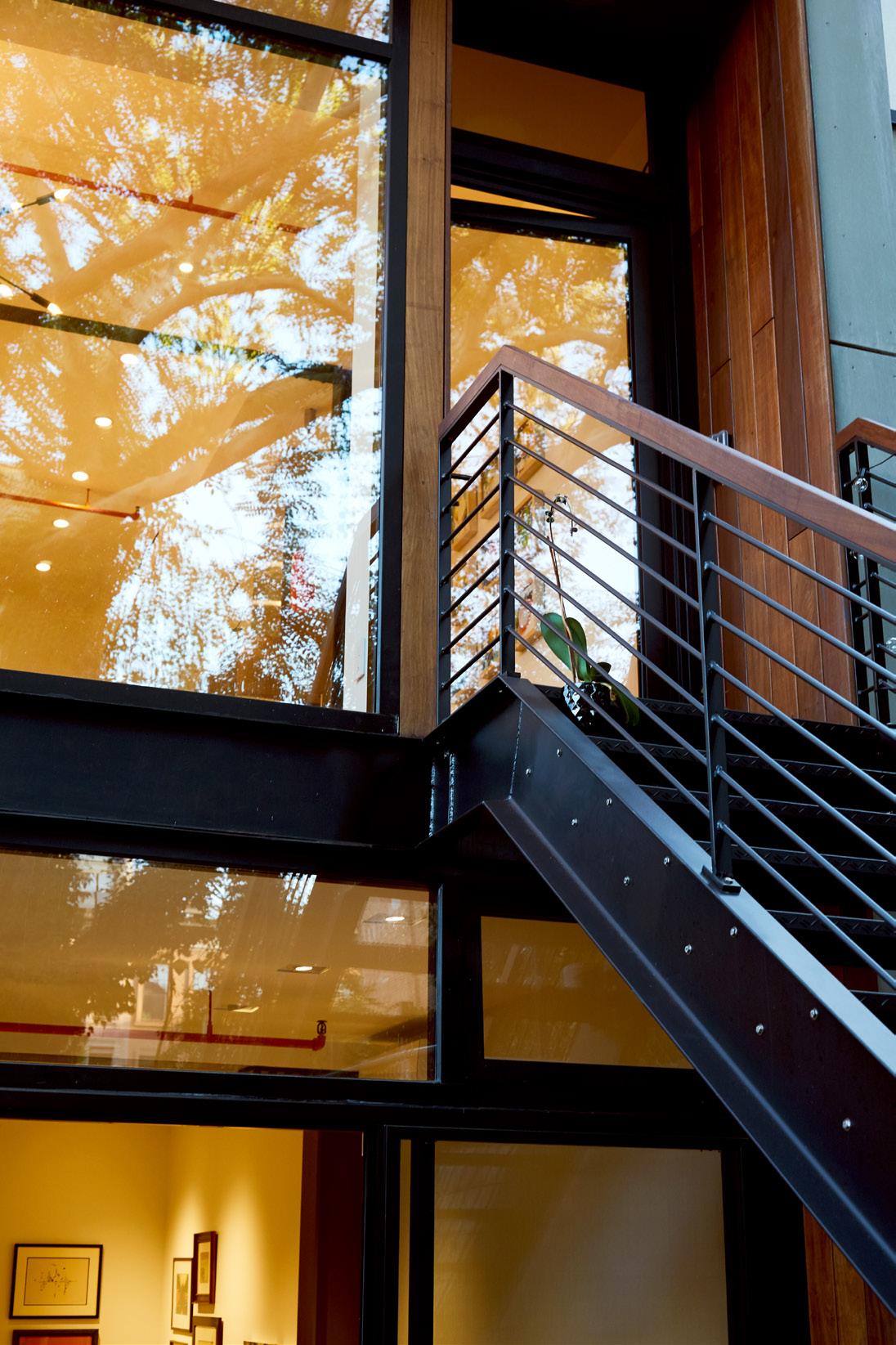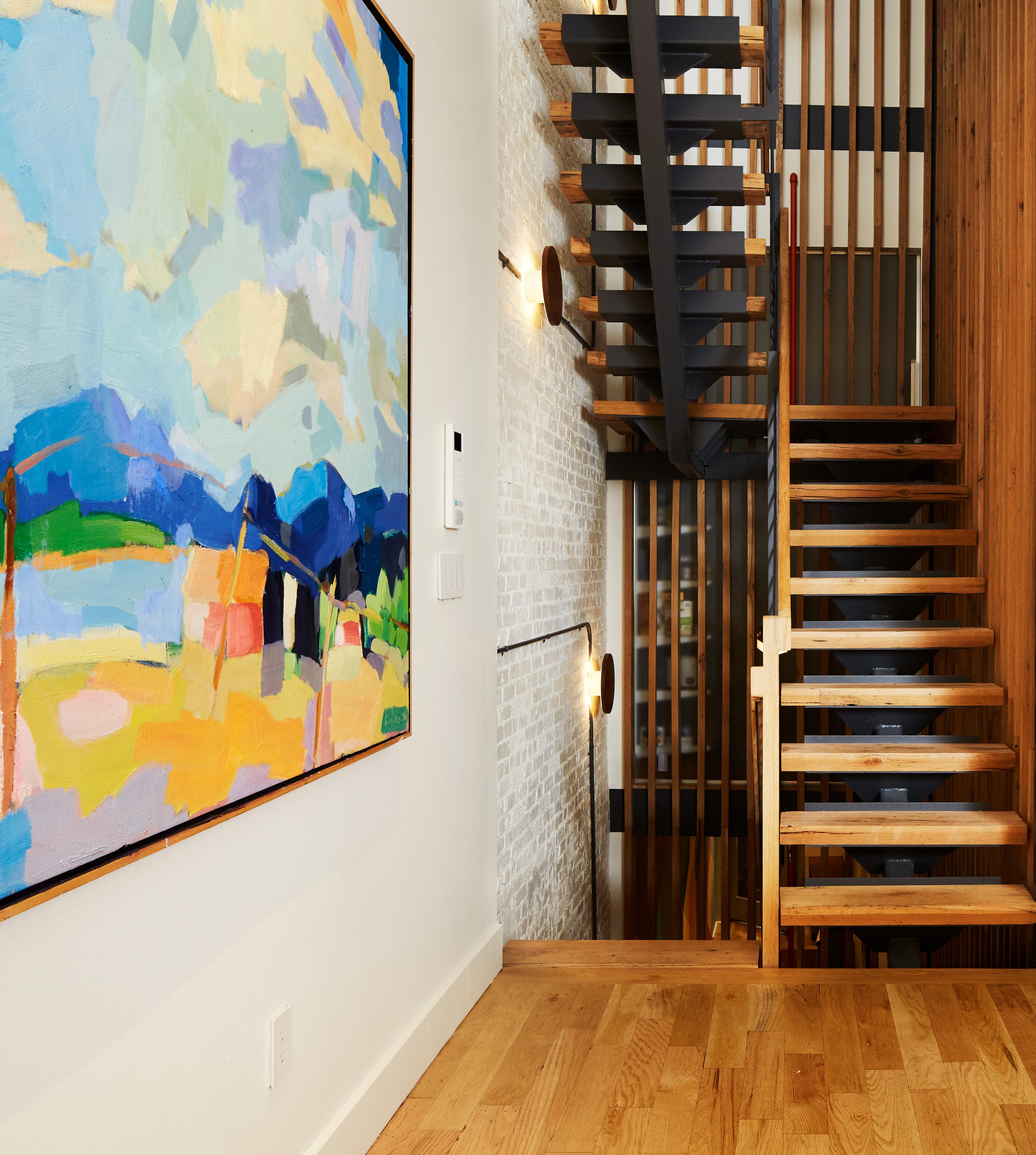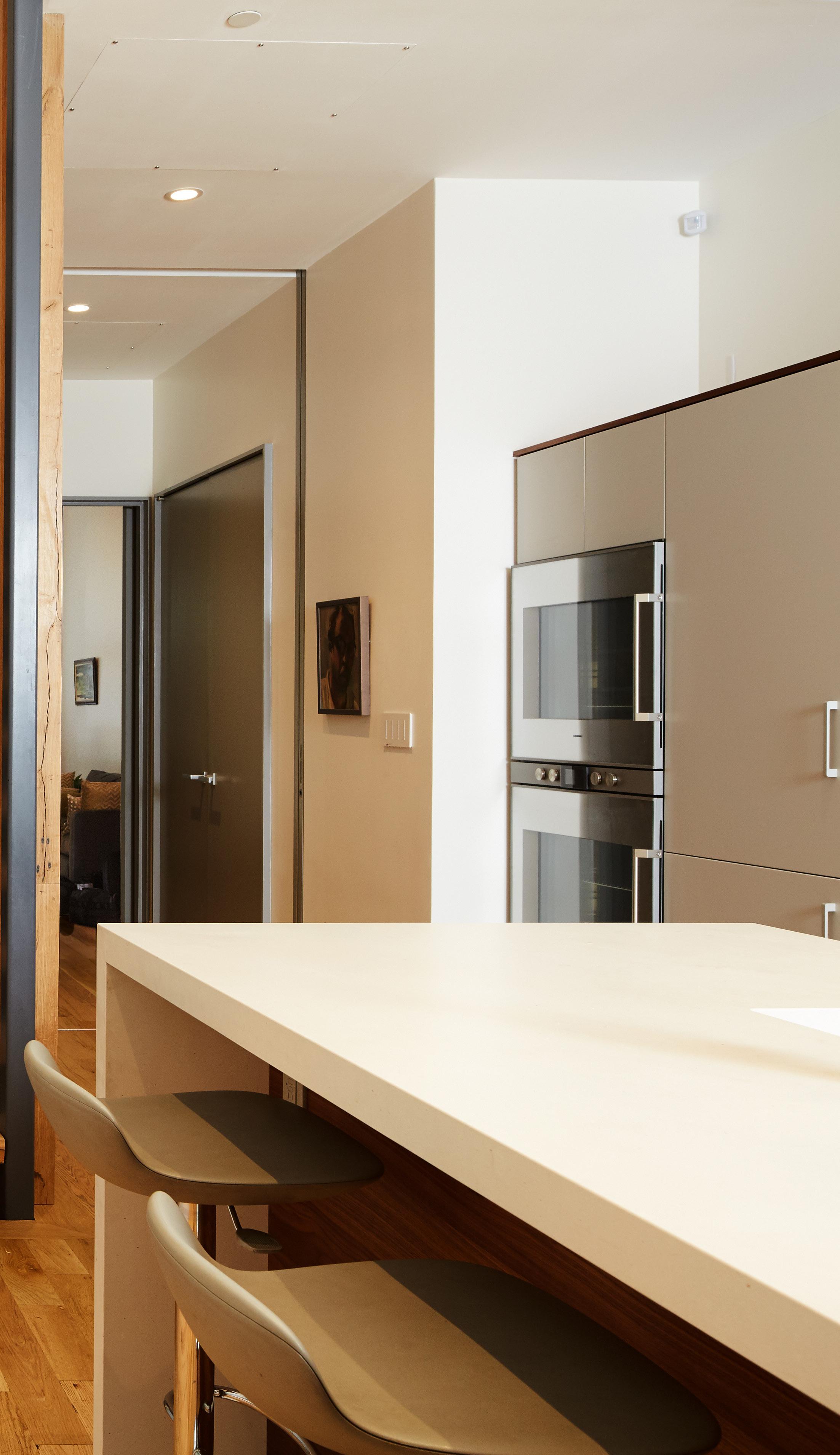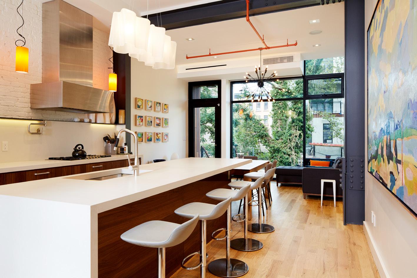 Exposed sprinkler piping, steel framing, and exposed brickwork in places like the kitchen were left exposed and painted to fit in with the new modern industrial and utilitarian aesthetic.