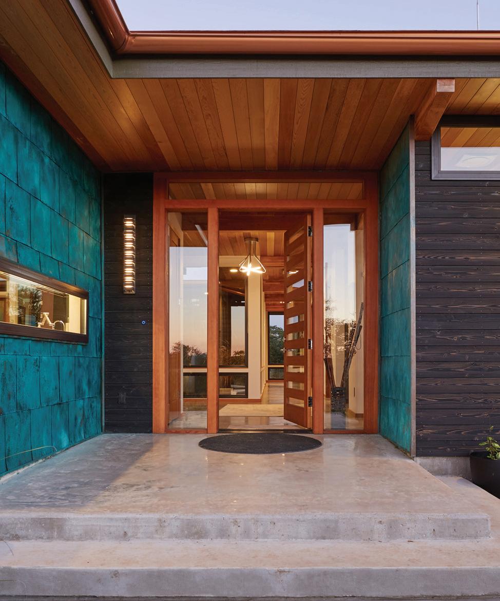 Rich, clear cedar soffits, turquoise copper panels, charred Japanese style yakisugi siding, and a glass-paneled entry door combine nicely with the entry lighting.