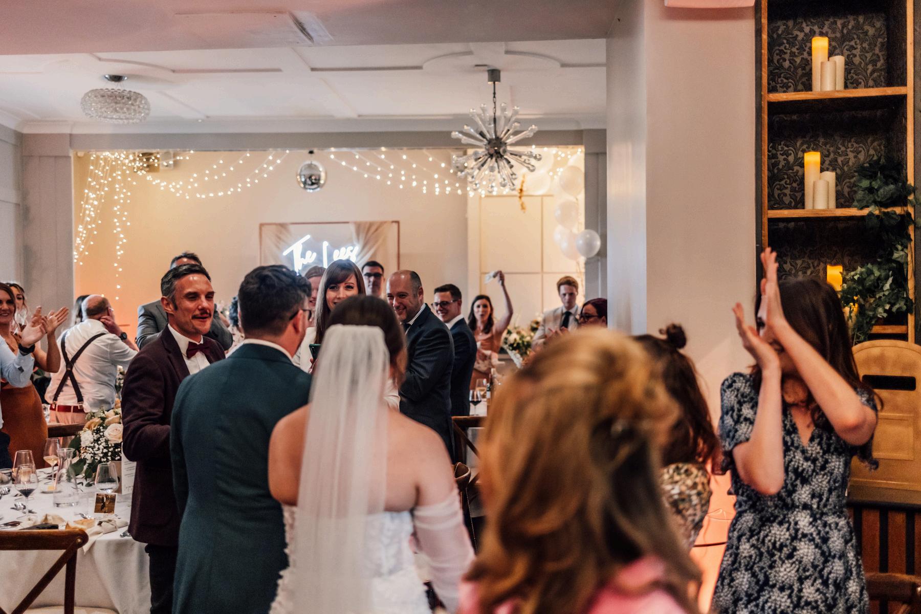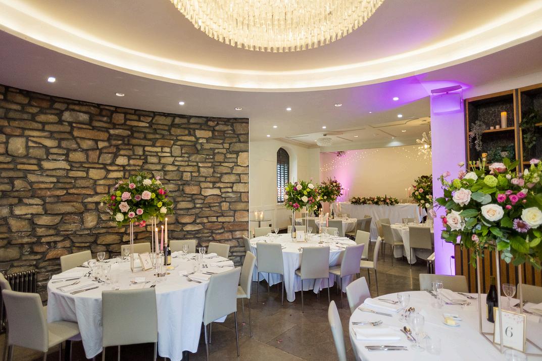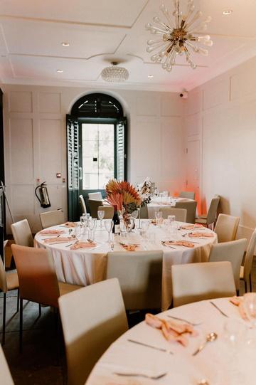 Furnished with a stunning chandelier and striking multitextured interior décor, the William West room is a unique space that can accommodate a range of layouts for ceremony and reception. With a bar, stage, Sonos music system, and Rako mood lighting, the William West can be seamlessly transformed from ceremony to reception by our efficient events team.
