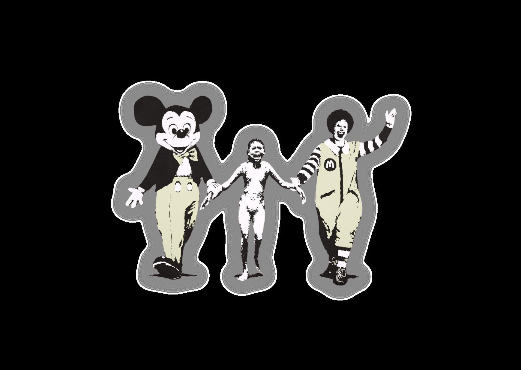 imperialism Their sinister presence emphasises the commodification of violence and the exploitation of human suffering for profit through the juxtaposition of Kim screaming in agony from the Napalm burns. Through "Napalm," Banksy provides a strong critique of the military-industrial complex and Western imperialism, urging spectators to confront the harsh realities of war and question their own role in perpetuating oppressive systems. “Napalm” addresses not just the horrors of the Vietnam war, but also the US-led invasion of Iraq in 2003 The juxtaposition of one of the most horrifying photos of war with two icons of American culture emphasises the commodification of warfare. Thus, the print functions as a call to action, encouraging spectators to engage critically with the artwork and to reflect on the interconnectedness of global issues.