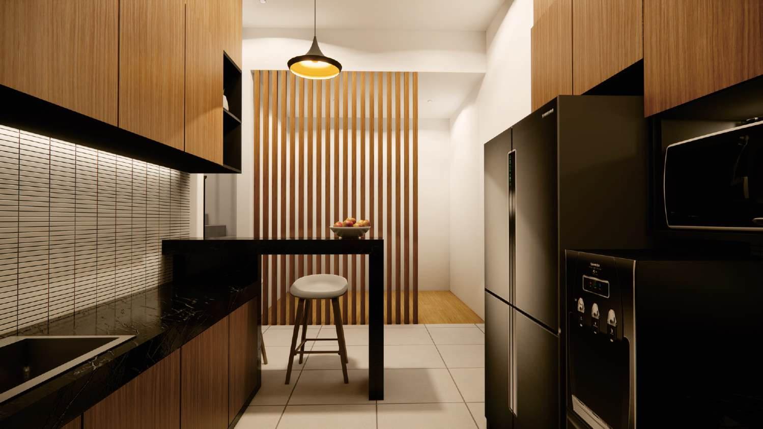 Desain interior tiap ruang bernuansa kayu yang akan menjadi garis besar dalam desain kali ini. Penggunaan perabot dibuat secara custom untuk memaksimalkan luas ruang dan kebutuhan pengguna.