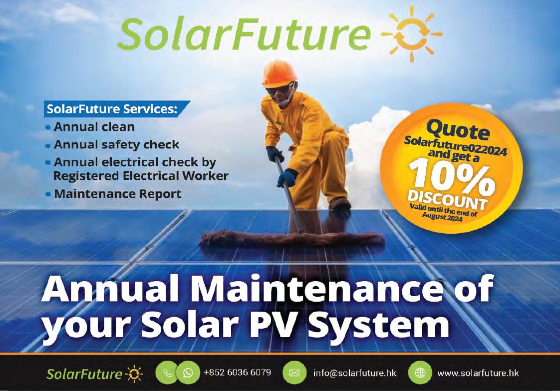 Prioritising efficiency and affordability, Solar Future services solar installations by area, and this is where you come in. If you have friends or neighbours in your area, who are looking for an annual service provider, ask them to contact Solar Future and quote your name to receive a discount on your maintenance for this year. To find out more, visit www.solarfuture.hk. [PHOTO COURTESY OF Solar Future.]