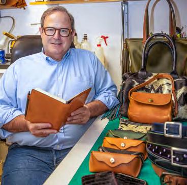 On another surface are some old boarding passes, which Alex is using to help guide his next project: the “perfect” travel wallet. On a high shelf is a birthday gift for his wife, a large olivegreen tote bag with his signature tassels on each side. It’s elegant, cool and, above all, incredibly well made with 100% saddle stitching (meaning it’s completely hand stitched, like everything Alex makes). It’s also one-of-a-kind.