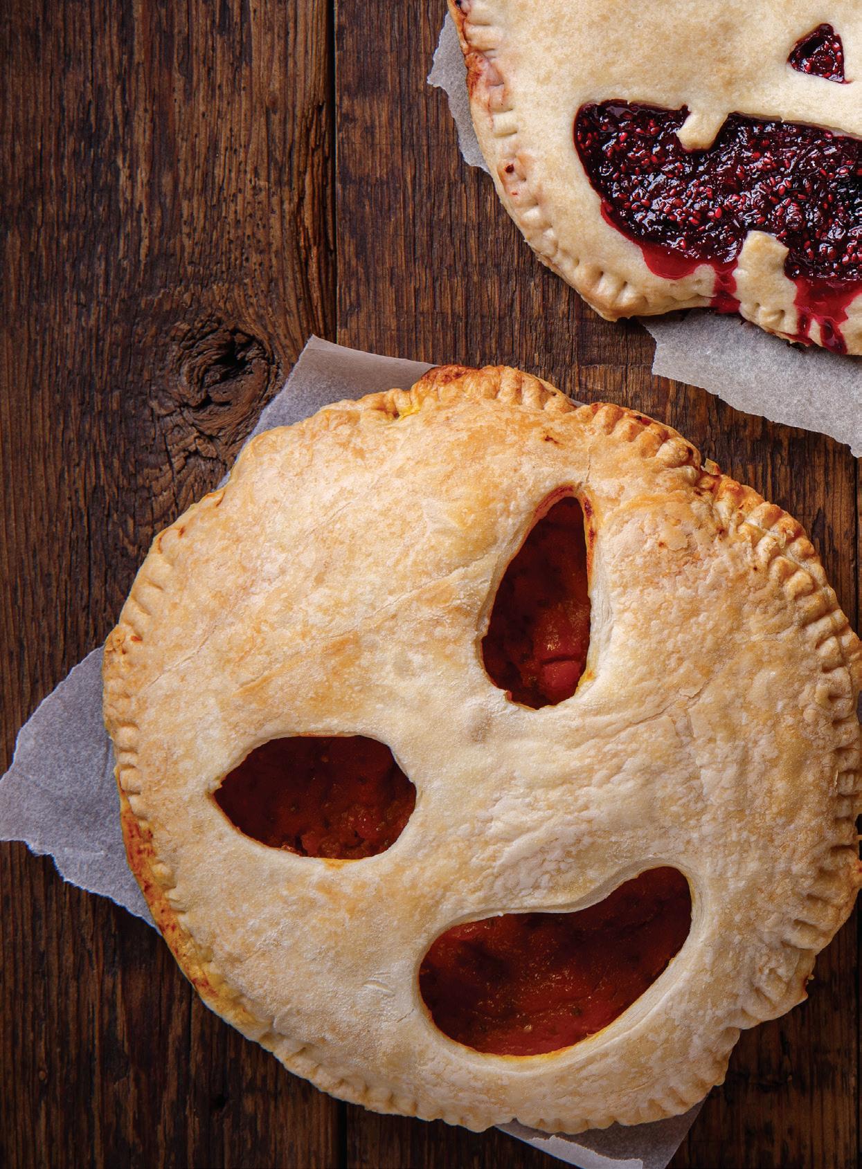 Shape 350g pastry dough into two circles, one slightly smaller than the other, then wrap in baking paper and chill in the fridge for at least 20 mins. Butter six holes of a muffin tin and line each with a strip of baking paper that overhangs the top. Roll the larger circle of pastry out on a lightly floured surface, and use a 10cm cutter to stamp out 6 circles. Press the pastry circles into the prepared muffin tin. Spoon in the squash filling. Roll out the remaining pastry circle, and use an 8cm cutter to cut out 6 lids. Cut spooky pumpkin faces into the lids. Press the lids over the pies and brush with the beaten egg. Bake for 40 mins until golden brown.