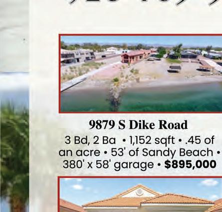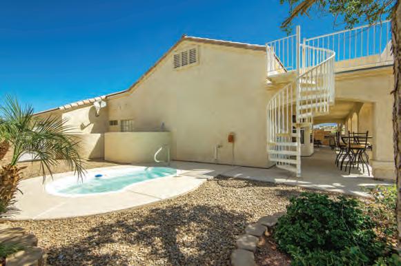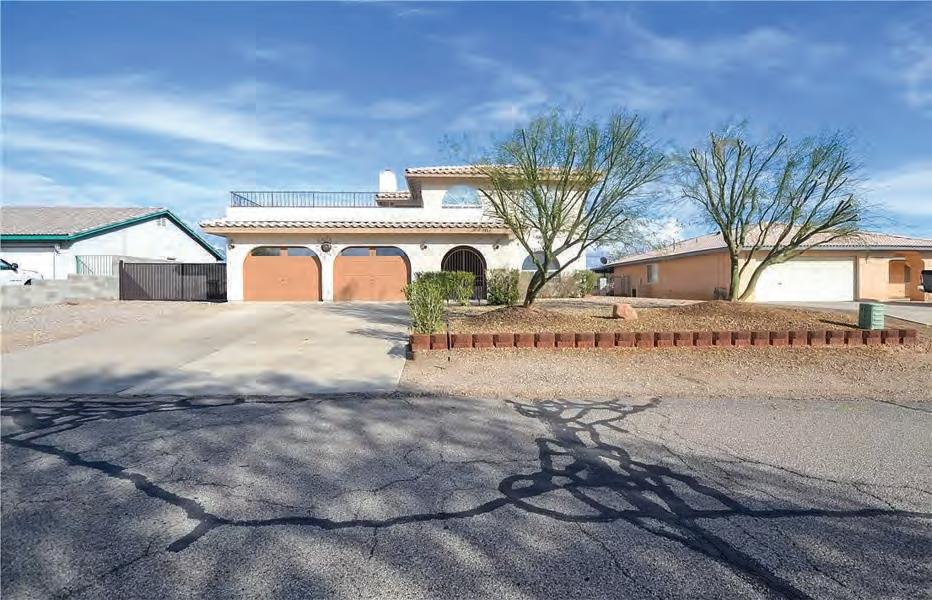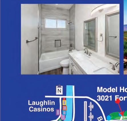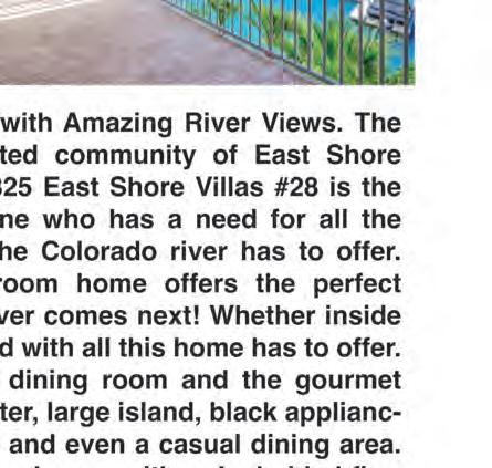 entry to single-level 3 bdrm, 2 bath oasis with no stairs! 2 cozy fireplaces, elegant granite countertops, and captivating views of the River, casinos and the mountains. Master suite with a luxurious jetted tub, dual sinks, a walk-in shower, and another fireplace. Pool, spa, swim-up bar, BBQ area, beach and river access. Private boat dock and water taxi to Laughlin. 40-foot deep garage with a 12’ door. Gated community. #012995 $595,000