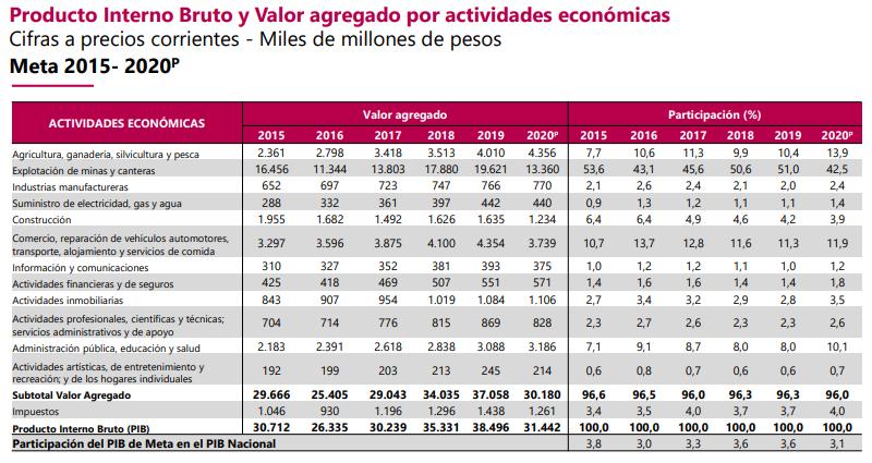 Una de las principales actividades que distingue al departamento del Meta, es la ganadería, agricultura, la silvicultura y la pesca. Como se puede ver en la siguiente imagen.