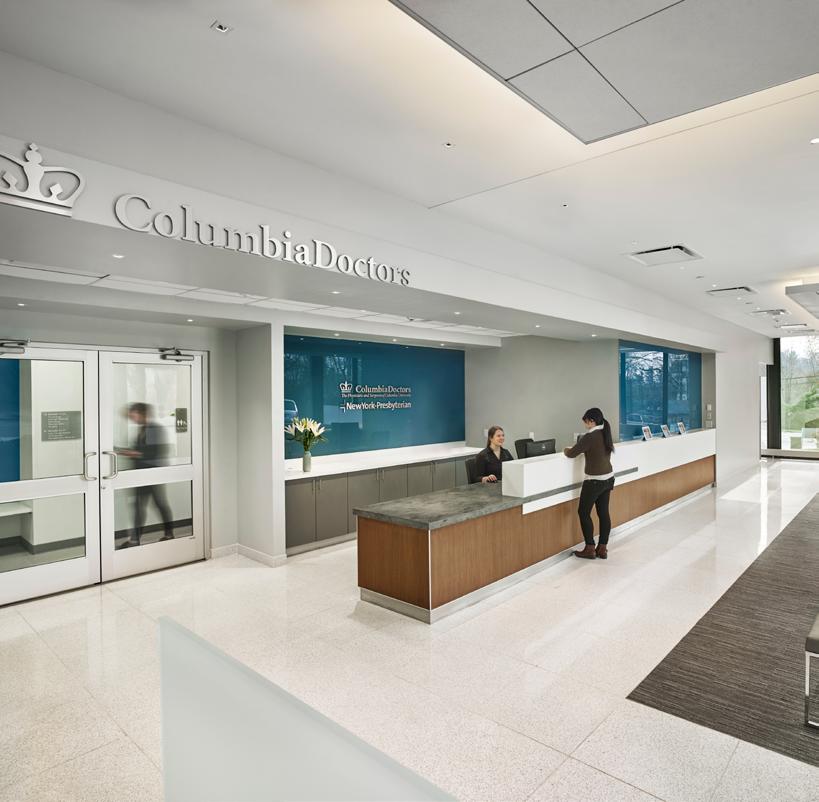 Columbia University Medical Center engaged Array Architects to expand their ColumbiaDoctors medical practice in Tarrytown, New York. The expanded facility includes a new vestibule with a canopy to provide convenient access from the parking area. The floor plan facilitates collaboration among physicians and is laid out with patients’ needs in mind. Colorcoordinated signage and accent walls help patients navigate the facility.