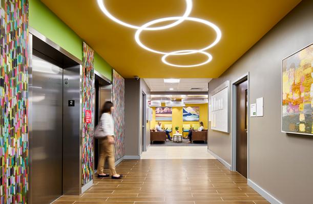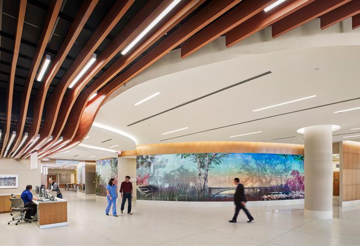 The design centers on the patient experience by incorporating artful details, an abundance of natural light and clear wayfinding for seamless transitions for patients, staff and materials. The lobby is inviting with an 80-foot mural depicting natural landscapes lining the curved walls and is accompanied by an open information desk and ample seating for patients and visitors.