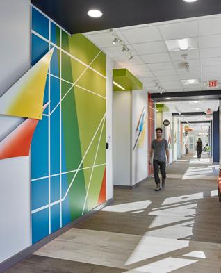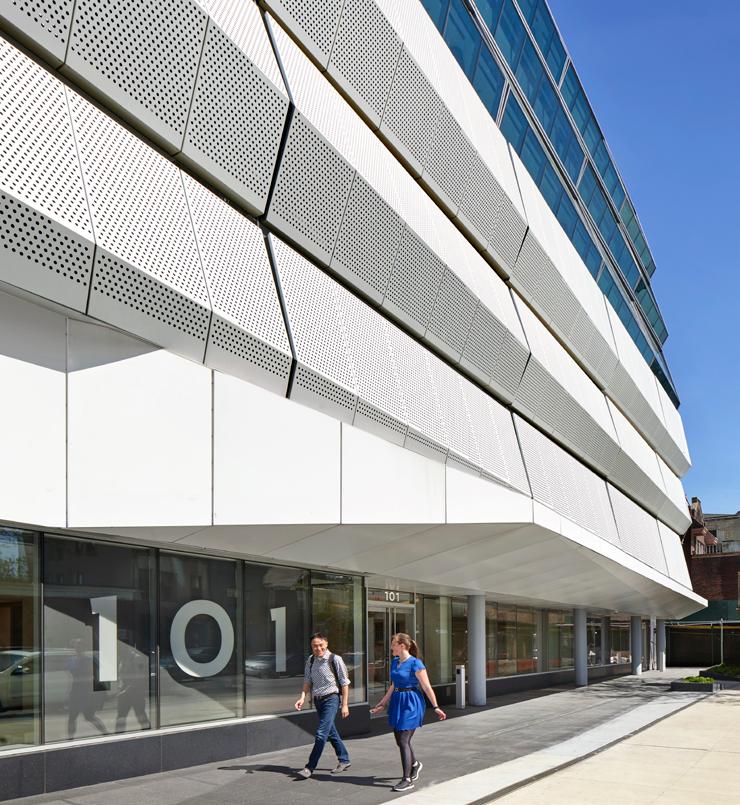 glows as a beacon. Parking and patient dropoff are raised to the second floor, allowing the sloped canopy to pull pedestrians in at the first floor level. Vehicular traffic can flow through the building, dropping passengers off at the 2nd floor Lobby and continuing out to street level. The facade was fabricated as a modular system allowing for a simplified install from the interior of the building, reducing street closure logistics.
