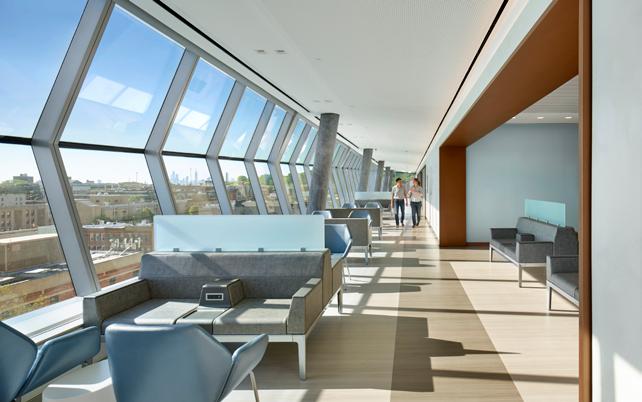 The seven upper clinical floors are based on modules and pods so space can easily be increased or decreased between groups as volumes dictate. Rooms can easily swing