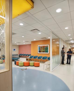 floor functions accessed from the mall include a four OR ambulatory surgery suite. Infusion programs are vertically connected by the lobby atrium and medical mall. The infusion bays have access to and views of a roof garden developed over the cancer center’s first floor.