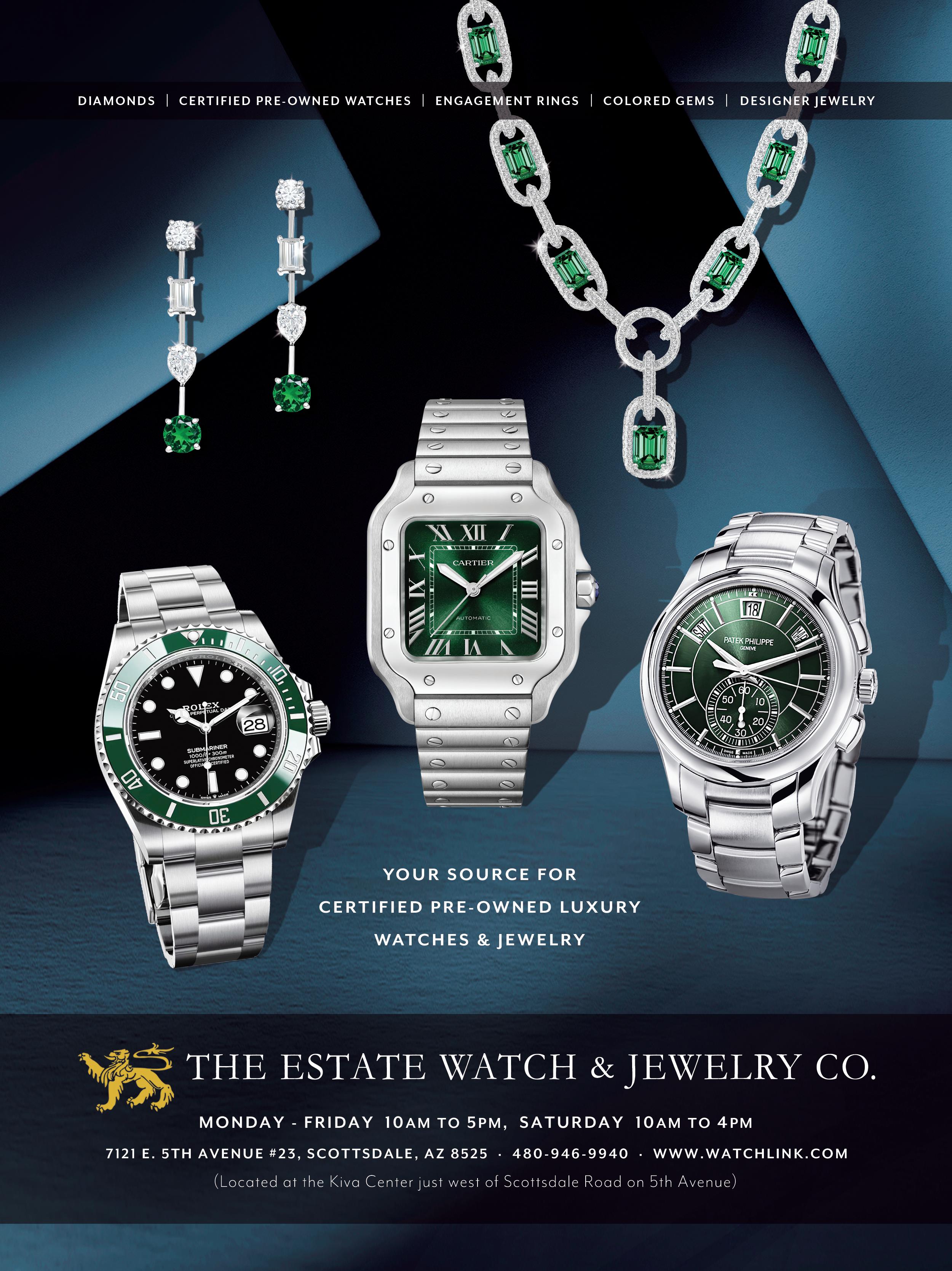 THE ESTATE WATCH & JEWERLY COMPANY—Appraiser and reseller of pre-owned jewelry, timepieces and loose diamonds. 7121 E. 5th Ave., 480.946.9940. watchlink.com Scottsdale Map G4