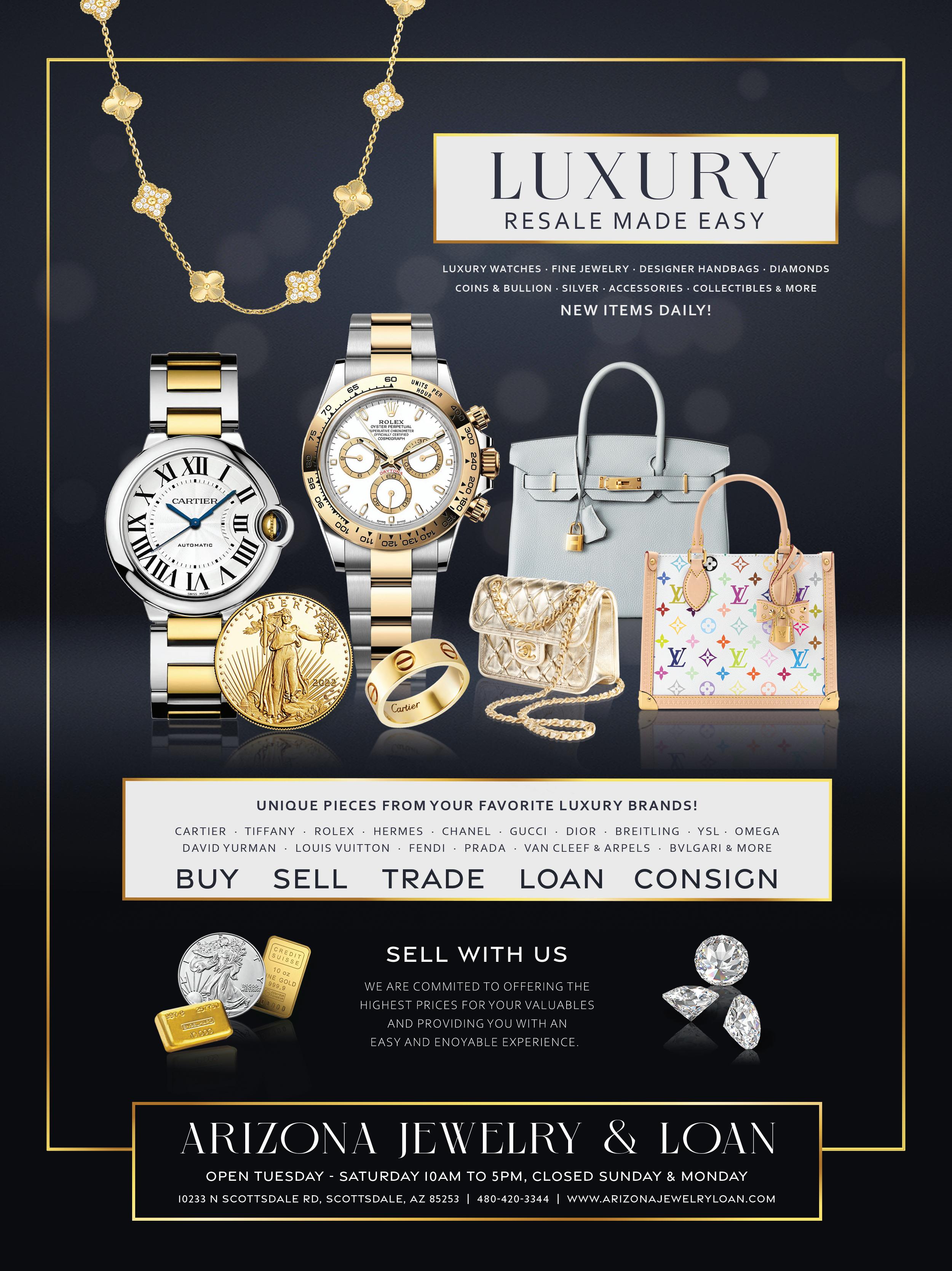 AZ JEWELRY & LOAN—Luxury resale made easy, from designer handbags to luxury watches, coins, and bullion to fine jewelry, and more. Buy, sell, trade, loan. 10233 N. Scottsdale Road, 480.781.4935. arizonajewelryloan.com Valley Map K18