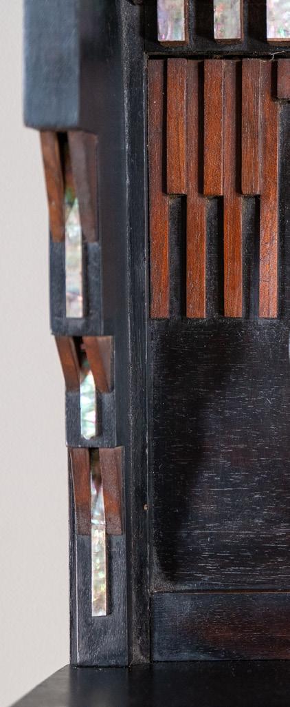 Carlo Bugatti, born in Milan in 1856, is best known for his innovative furniture and interior design, which are characterized by their use of unusual materials and decorative motifs. Bugatti had an artistic background, his father being an architect and sculptor. His sons carried on this tradition, Rembrandt becoming a sculptor of some renown and Ettore, a car designer, founding the Bugatti automobile company. Around 1880, after training in architecture and cabinetmaking, Carlo Bugatti opened his own studio in Milan and began to produce furniture. Its inventive and theatrical construction gradually evolved from dramatic rectilinear shapes to more fluid forms. This furniture was unique in its time and remains so today.