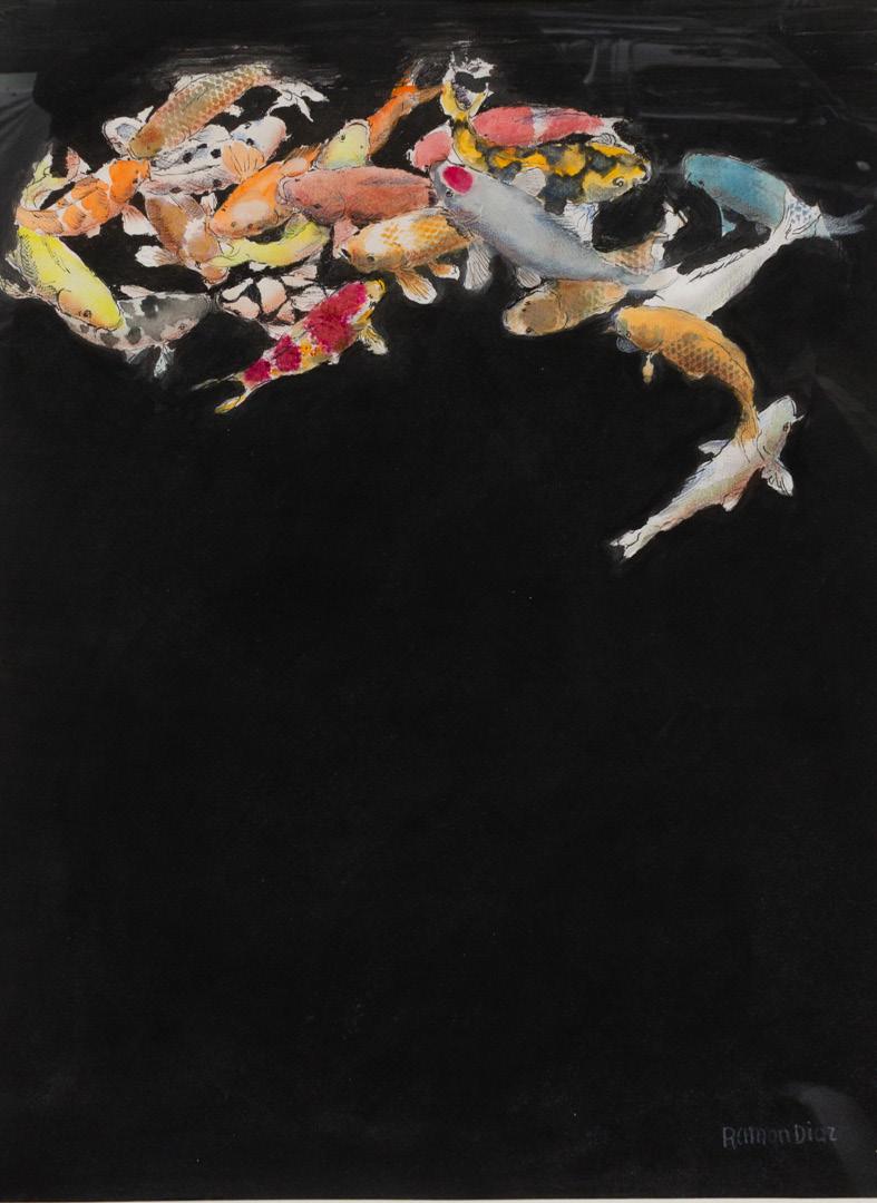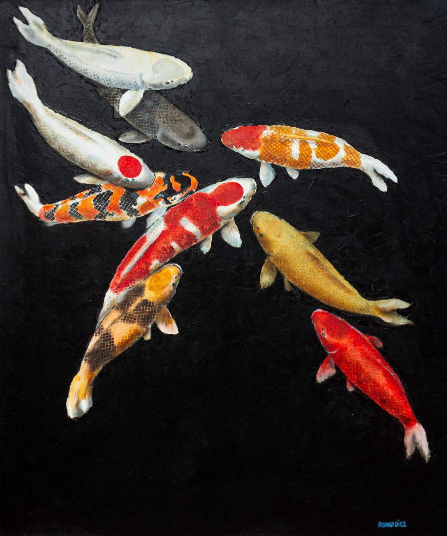 Across the gallery, sumo wrestlers propel forward, grapple, and pivot. Horses canter, gallop, and rear, their manes dissolving into smoky washes. Koi fish swirl and twist, delicate yet firm against black ponds. In sepia tones, nudes stretch and sprawl as odalisques in Diaz’s signature visual language. Some figures echo the darkness of Goya, while others recall the taut elegance of Italian sculptor Marino Marini. These historic references merge with a sense of the contemporary, each form entering the canvas with Diaz’s grounded confidence as an artist, developed throughout the years.