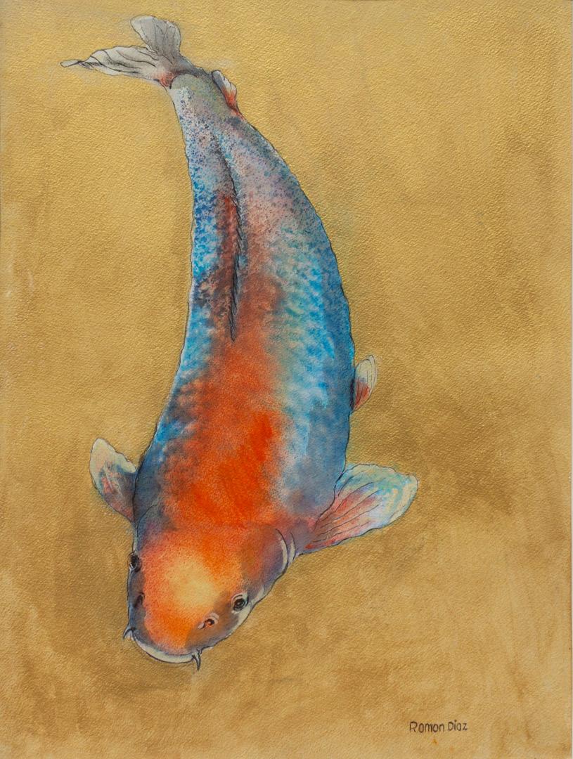 Landscapes, strangers, and the past mingle with the present, are distilled into forms that feel heroic yet intimate, monumental yet human, playful yet commanding. His slight exaggerations mirror the way Diaz tells his stories, in a manner always humorous and very umch alive. Desire is never literal. It appears in how figures press against space and how a koi or nude seems to breathe with its own internal rhythm.