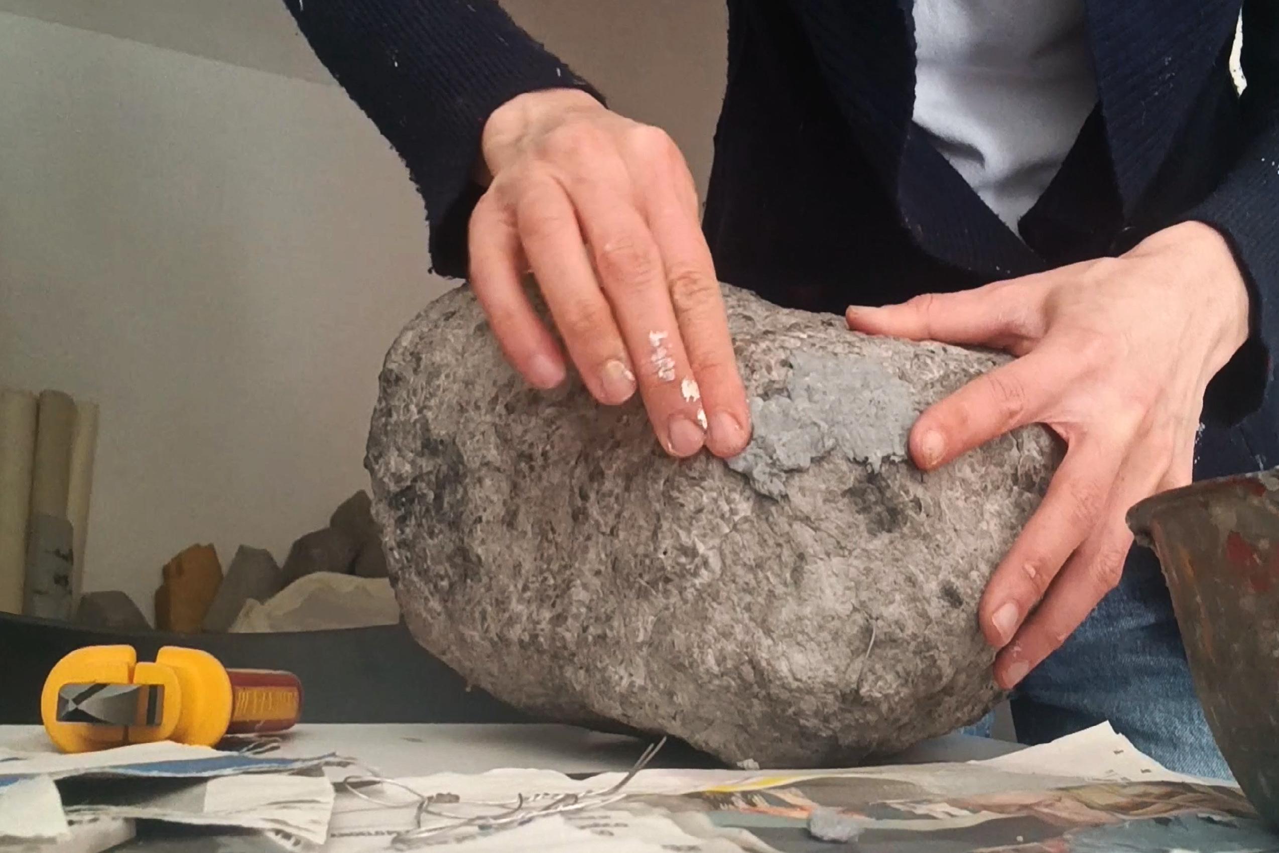 Il primo passo per realizzare la cartapesta è immergere la carta nell’acqua. Un gesto che, nella pratica artistica di Heidarzade, ubbidisce sia a un’esigenza tecnica sia a una ritualità legata alla funzione salvifica dell’acqua, comune a molte religioni. Parole e foto drammatiche sbiadiscono, l’inchiostro si scioglie nel grigio, che poi darà alle pietre un colore assolutamente naturale, in contrasto con il loro peso. Infatti, la leggerezza delle pietre fa scattare un corto circuito concettuale tra realtà e apparenza, richiamando il materiale d’origine, quei giornali sporchi di dolore.