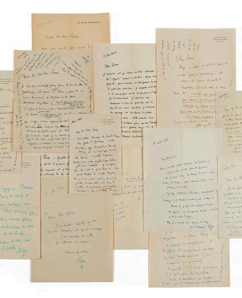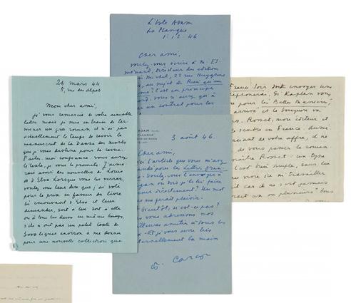 8 L. A. S adressées à Louis Aragon ou Elsa Triolet. 7 octobre 1944 – 24 janvier 1963. 22 p. in-8 et in-4. certains ff. à en-tête. Bel ensemble de 18 lettres signées, adressées à Louis Aragon ou Elsa Triolet.