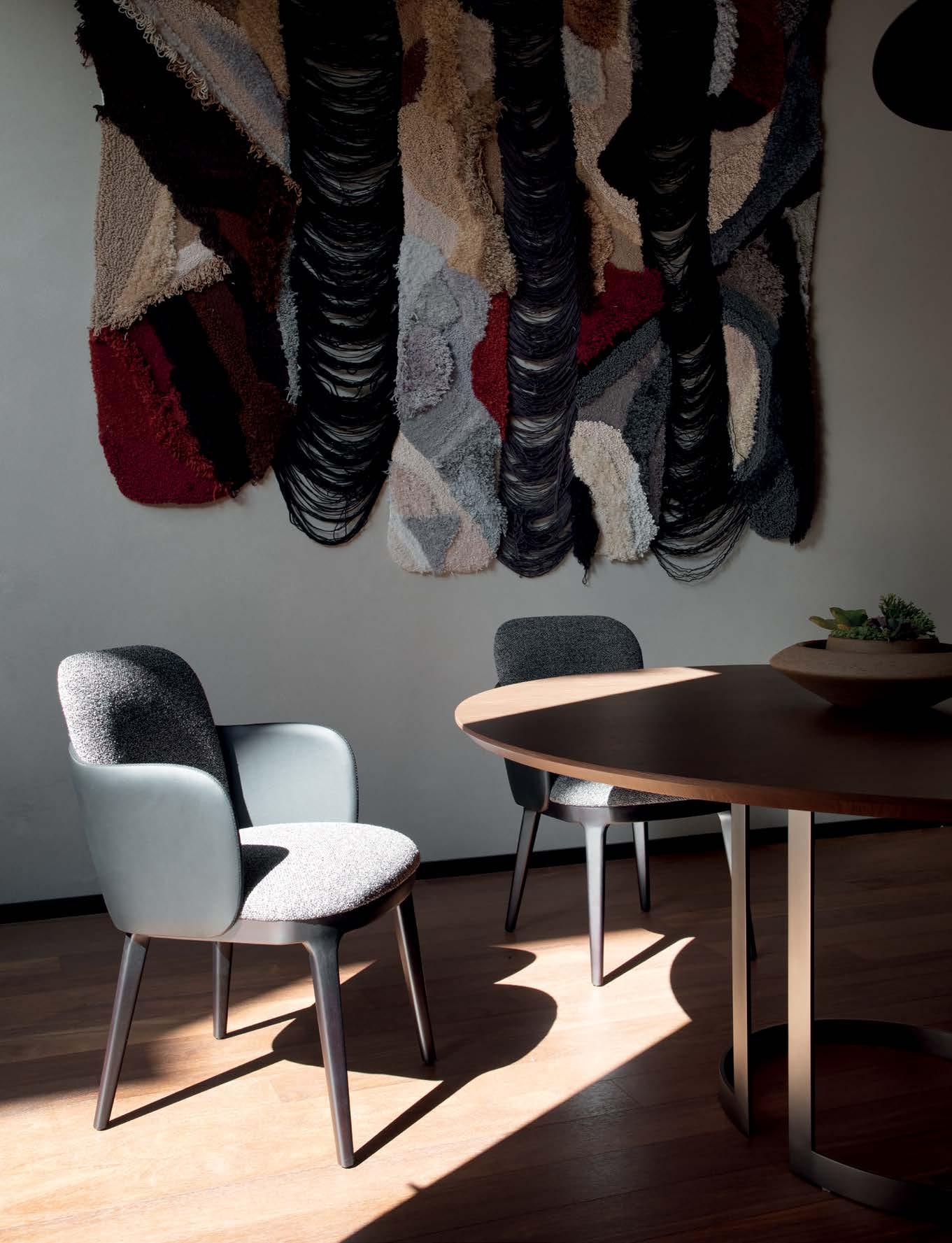 na Pollux, a mesa de jantar Lena II, as mesas laterais Fylla, as mesa de centro Jud e, sobretudo, o sofá Eos. Móvel que, com seu desenho fluído, segundo a arquiteta, ajuda a imprimir personalidade ao ambiente.