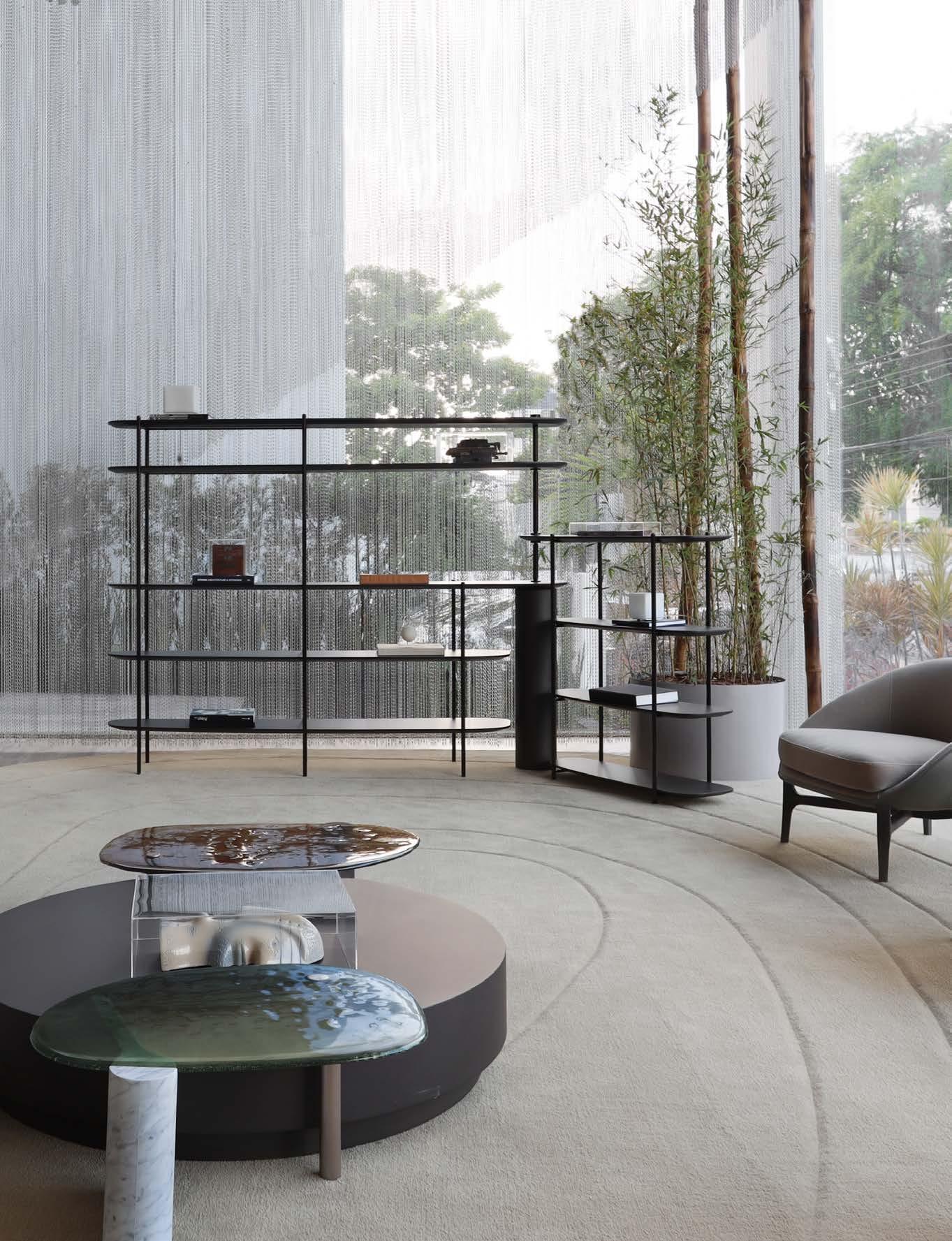de formas curvas e tons escuros, em equilíbrio com o living. Ao fundo, estantes decorativas fazem a composição com o espaço de leitura, em harmonia com as obras de arte”, explica o sócio Raphael Barbosa.