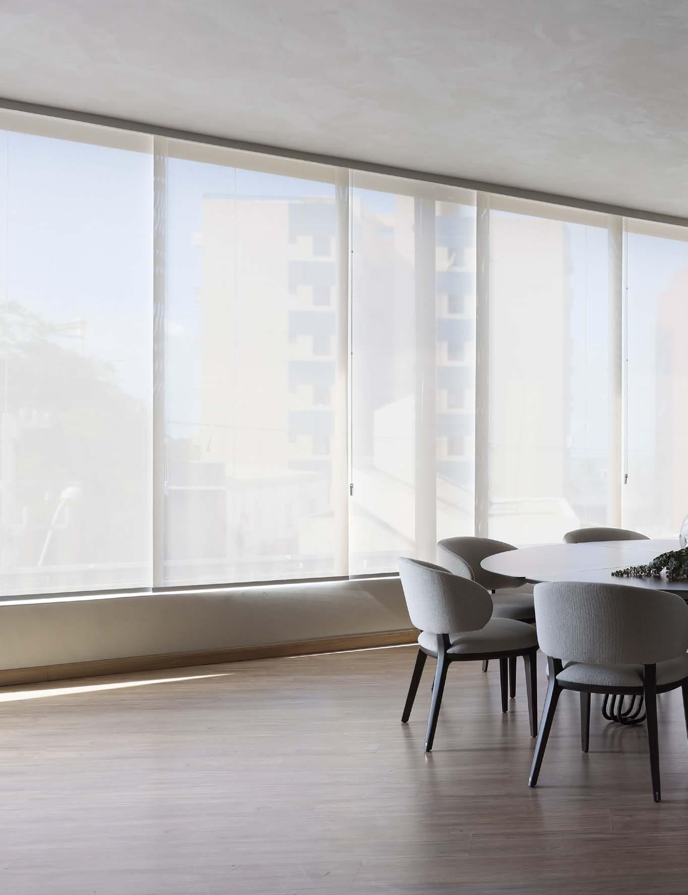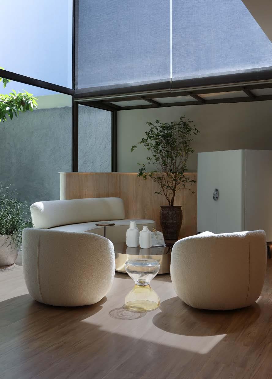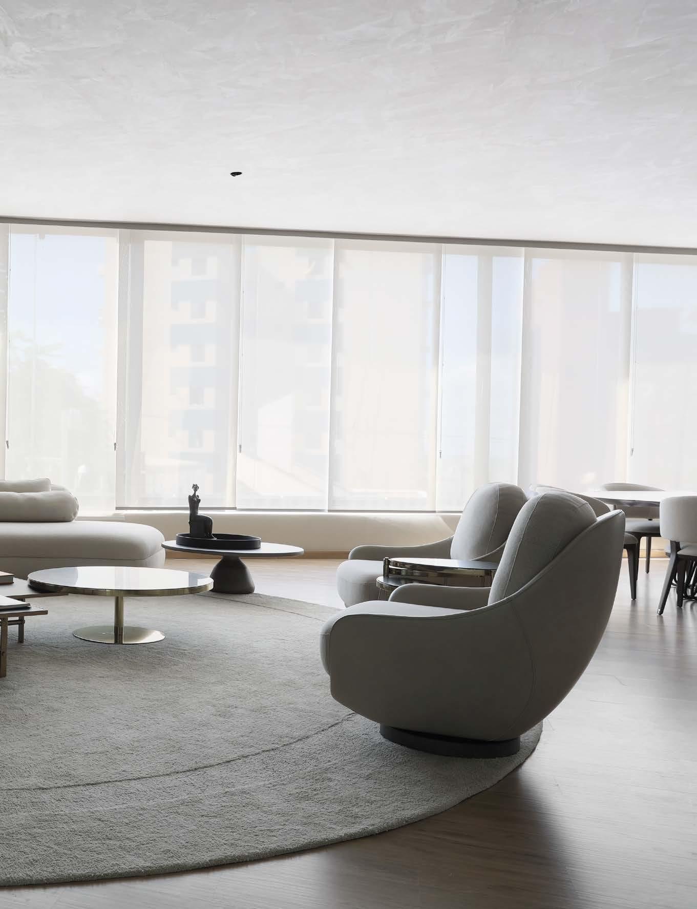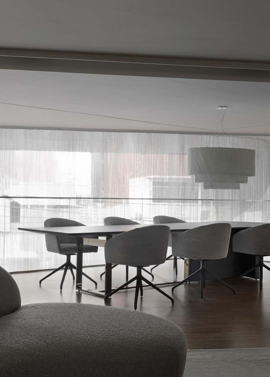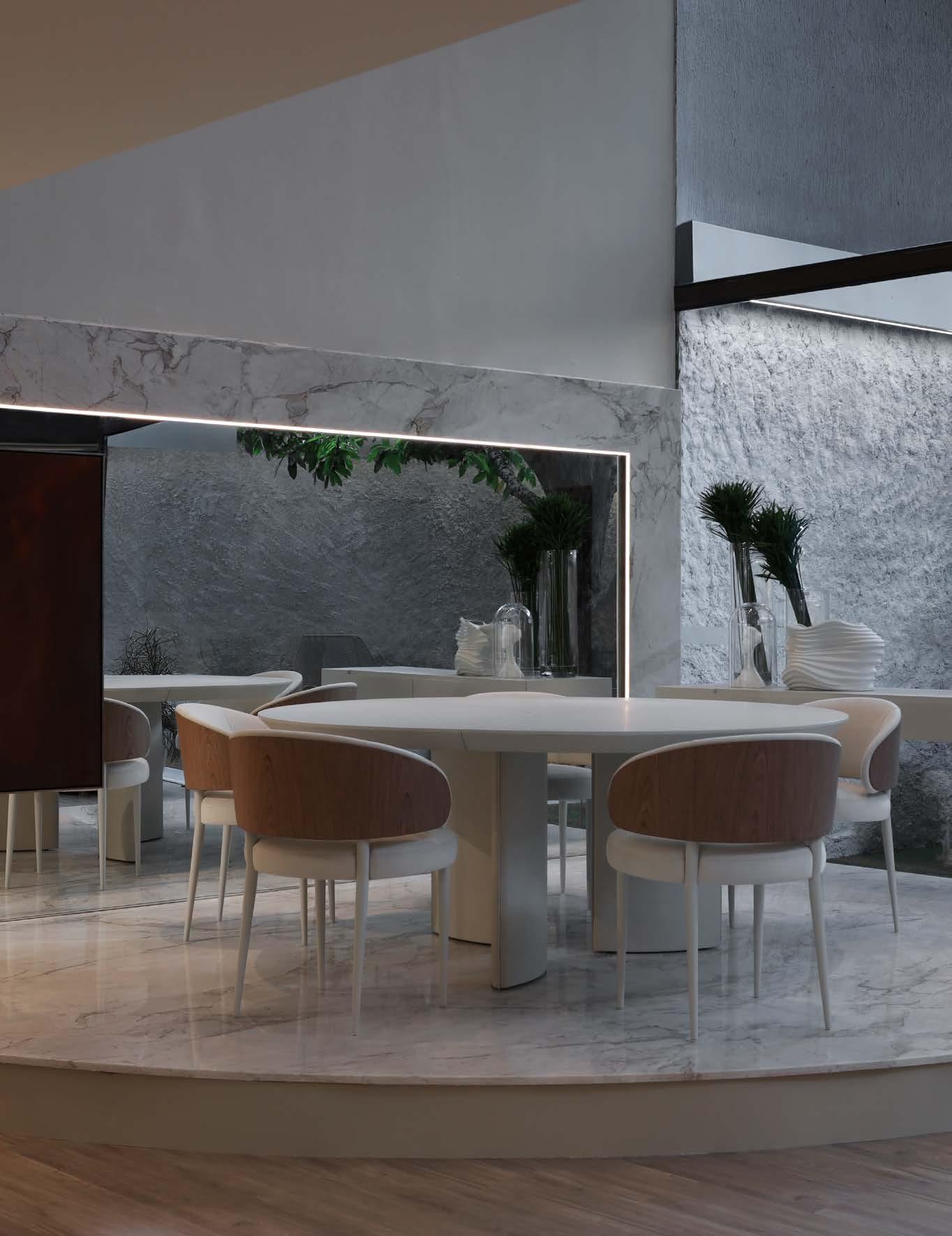 Como grandes protagonistas, os sofá EOS, em duas versões de tamanho, e a mesa de jantar Minos. O primeiro, por seu formato orgânico, tomado como ponto de partida para