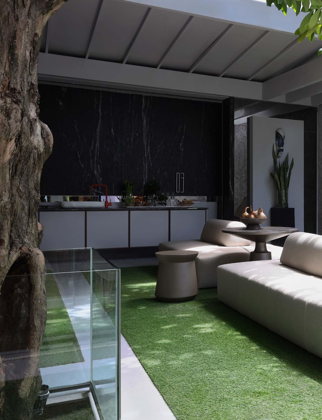 A abordagem que norteia os projetos da Oficina Arquitetura, dos arquitetos Ana Cristina Batista, Daniella Figueiredo e Yuri Fernandes é o equilíbrio entre estética e função. “Acompanhamos a narrativa da arquitetura, com elementos estilísticos e conceituais. Linhas geométricas, elementos na natureza e muita contemporaneidade. Tudo isso faz parte do nosso repertório”, conta Ana. Em sua primeira participação na Mostra Artefacto, os arquitetos apresentam um espaço de 200m², composto por uma sala de jantar, um living e uma varanda bar. Como objetivo primordial, receber visitas, sejam elas de fami-