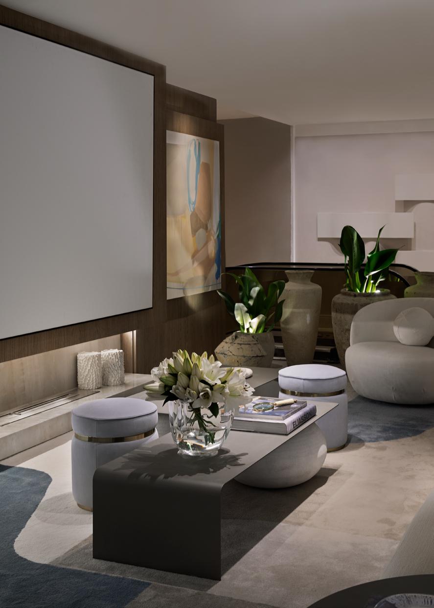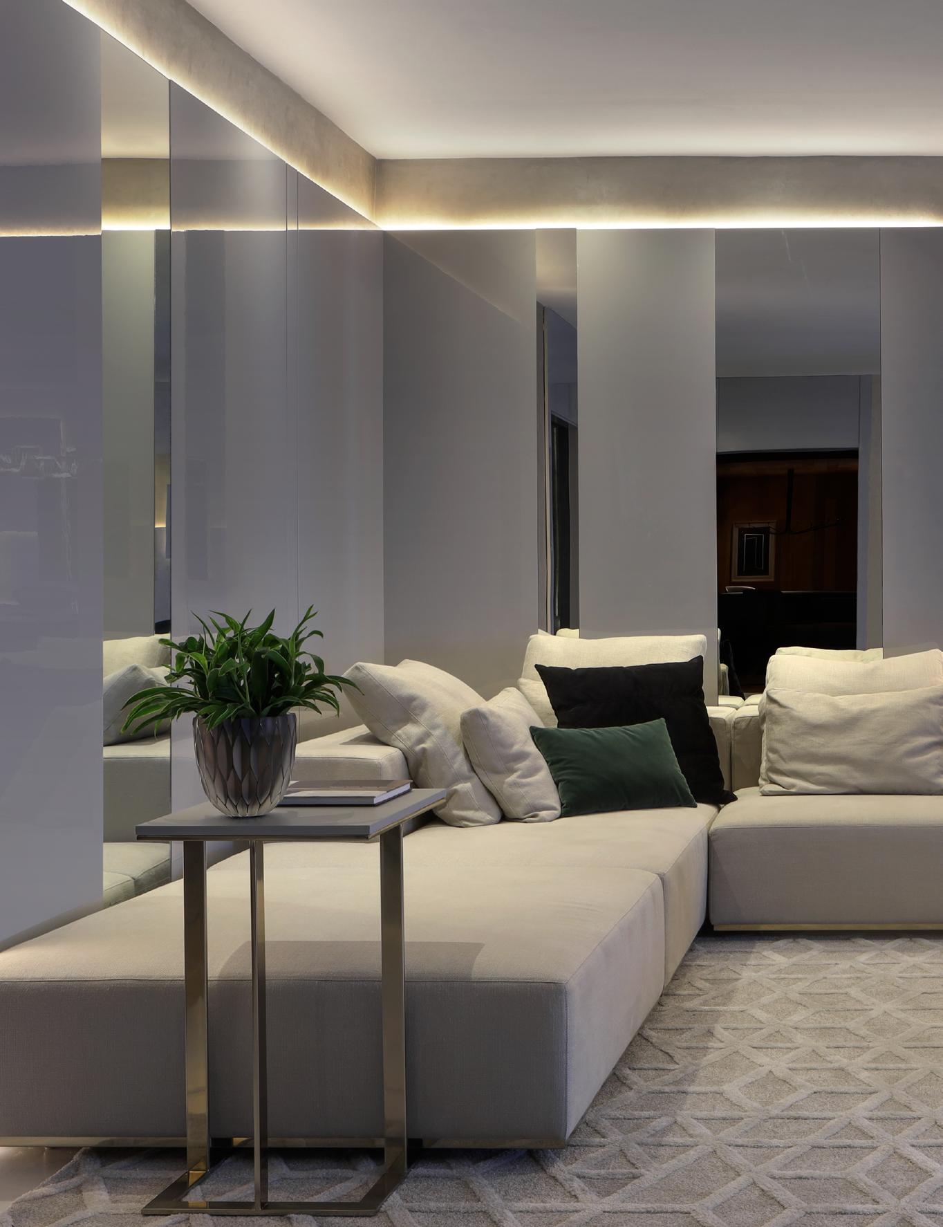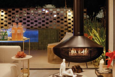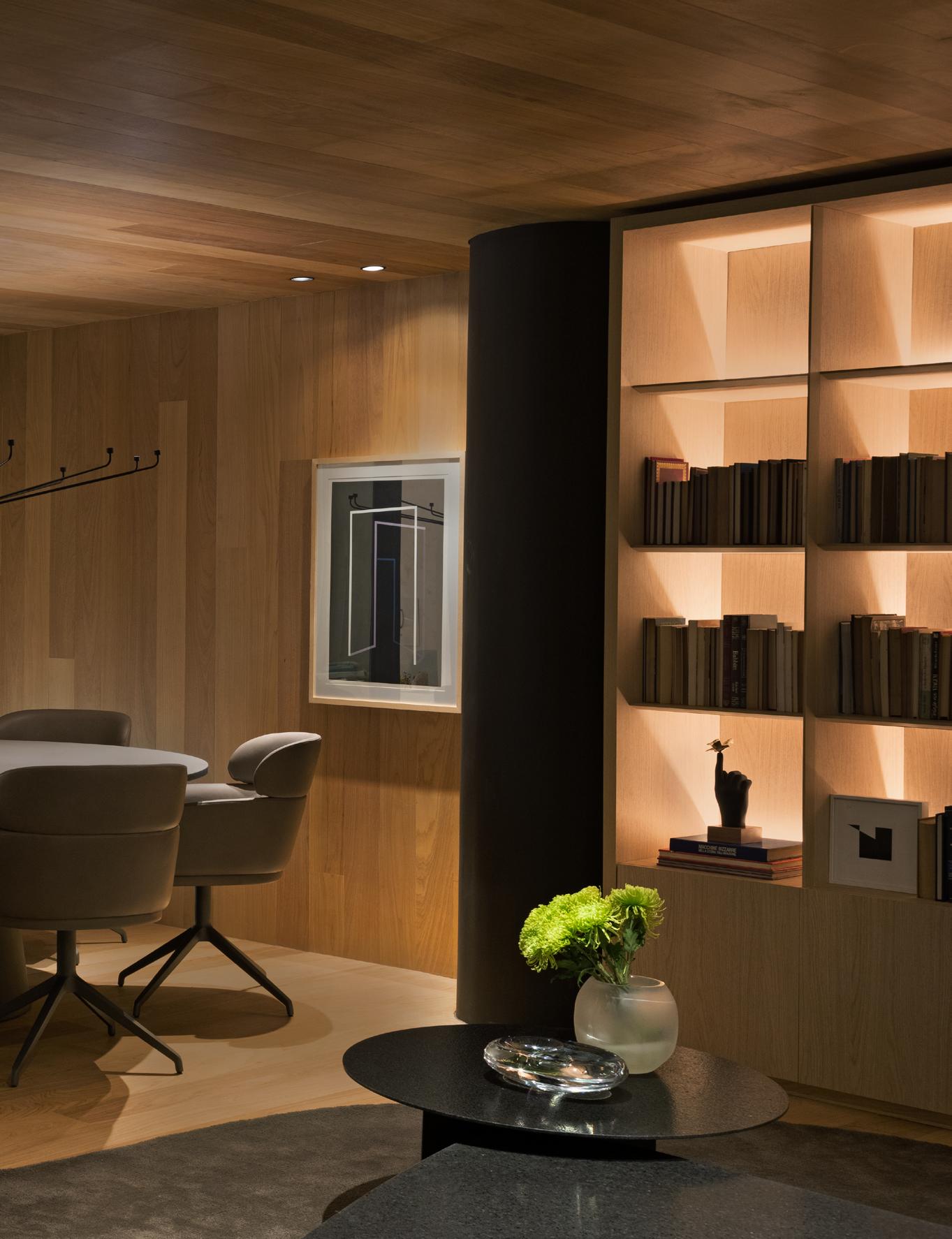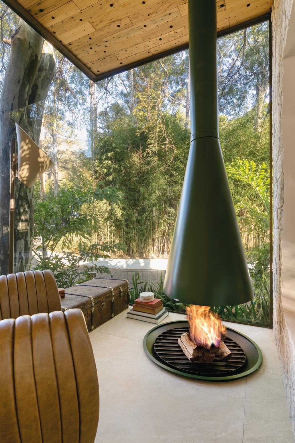 determina, de maneira sutil, um home-office, Por fim, um pequeno ambiente de estar, com poltronas e mesas de apoio, tem sua atmosfera invernal reforçada pela presença de uma lareira suspensa, vinda do teto.