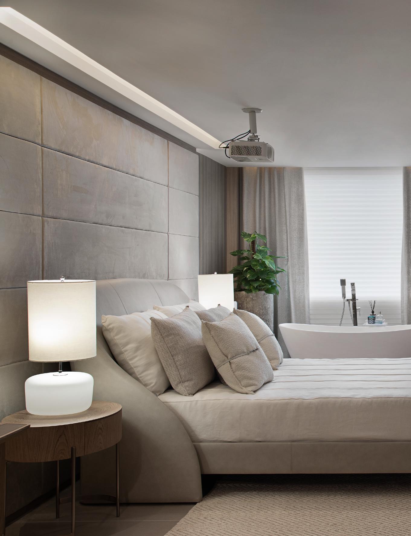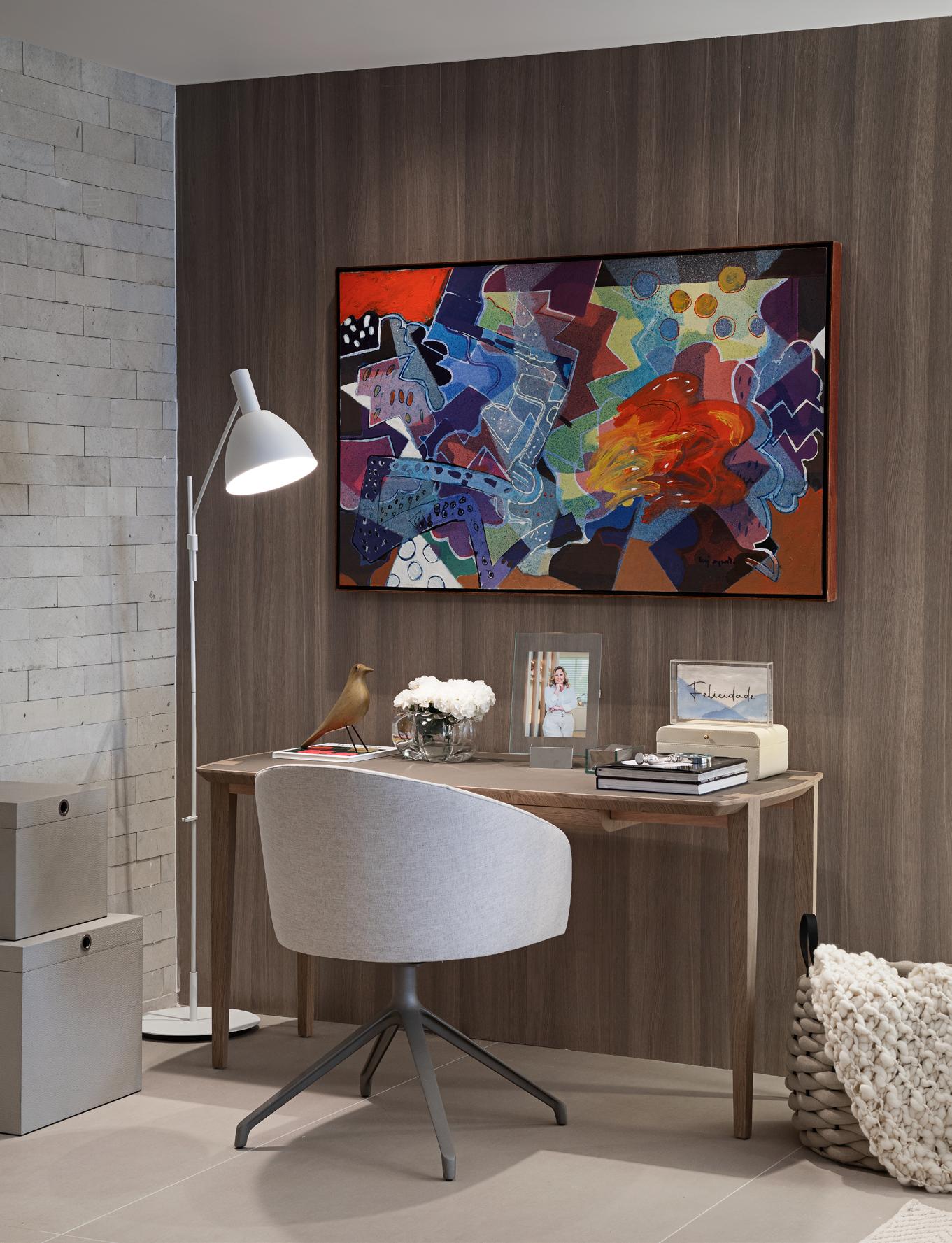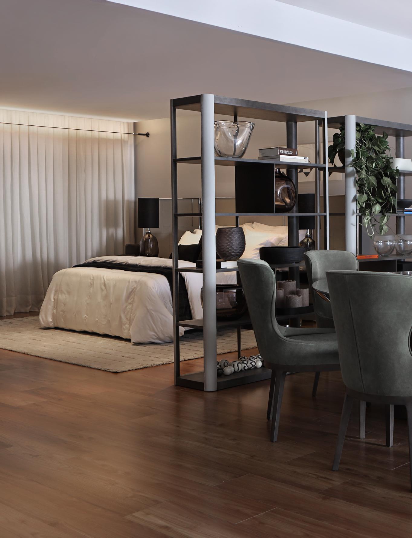 Felicidade, para o arquiteto carioca Lucio Nocito, é saber levar a vida de forma leve e equilibrada. E, para tanto, uma casa organizada, acolhedora e funcional já é metade do caminho para iniciar um dia feliz. “Acompanhado de um bom café expresso então...”, comenta ele, que para a vitrine da Mostra Artefacto deste ano, projetou um quarto tendo em mente um casal sofisticado. Apreciador de arte, de um bom vinho, de um clima mais frio. Uma atmosfera única para um local especial: Itaipava, na região serrana do Rio de Janeiro. Assim, em pouco mais de 32 m², em função do pé-direito duplo, uma estante de marcenaria freijó, de grandes dimensões, foi projetada para atuar como ponto focal da vitrine, enquanto, acoplada ao móvel, uma escrivaninha
