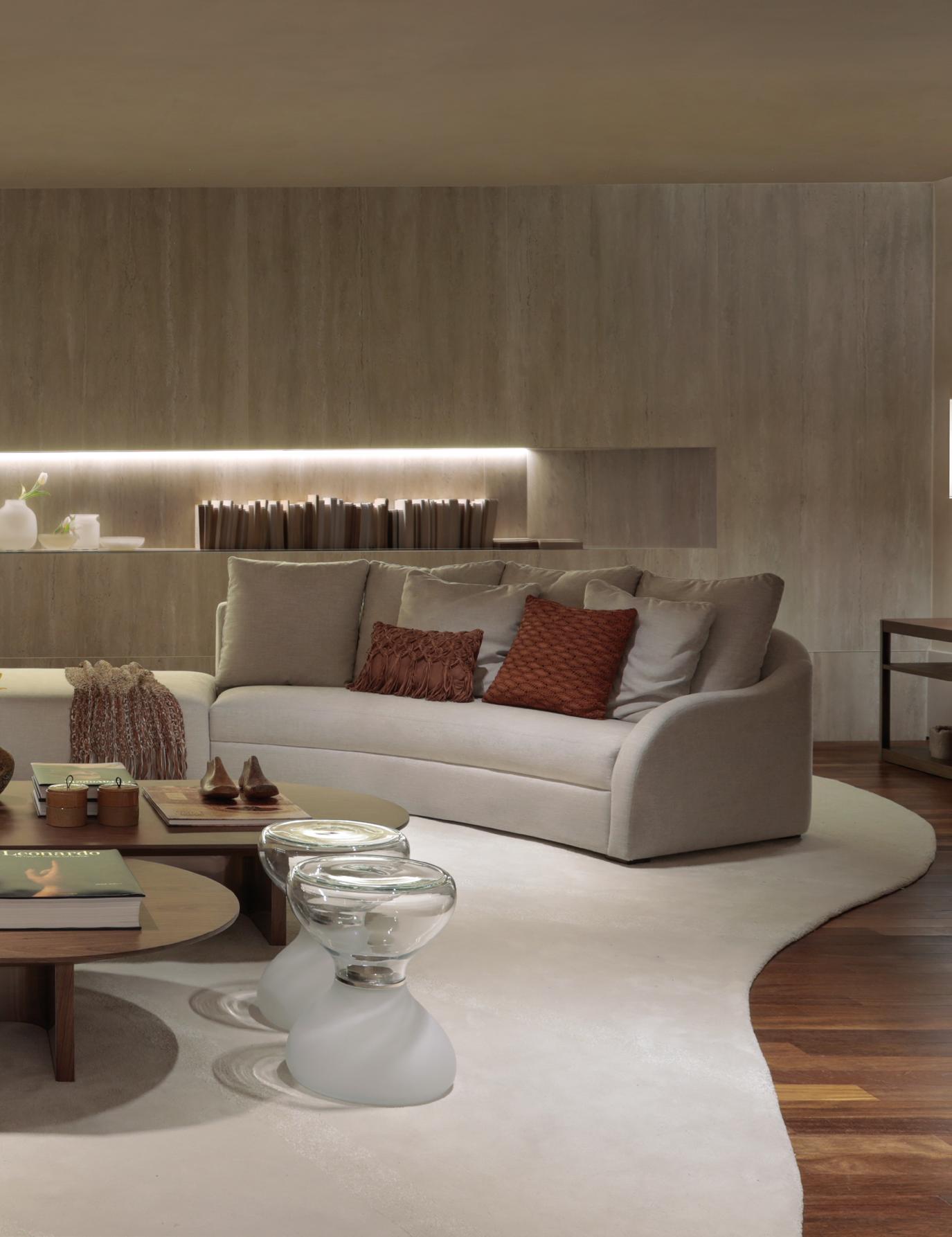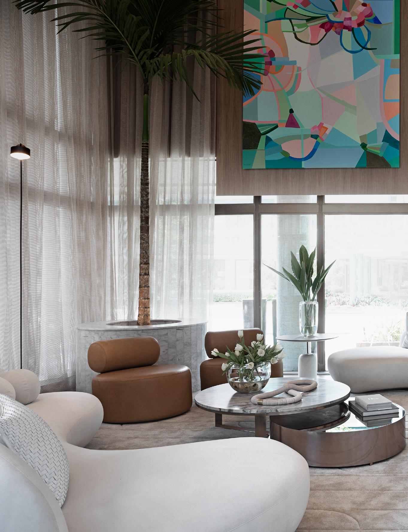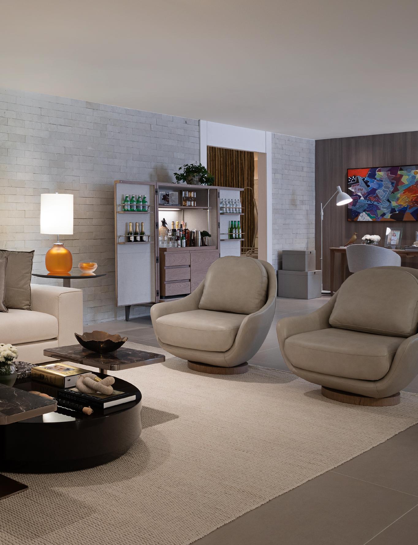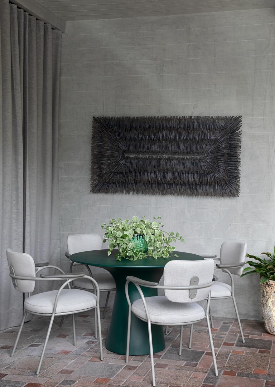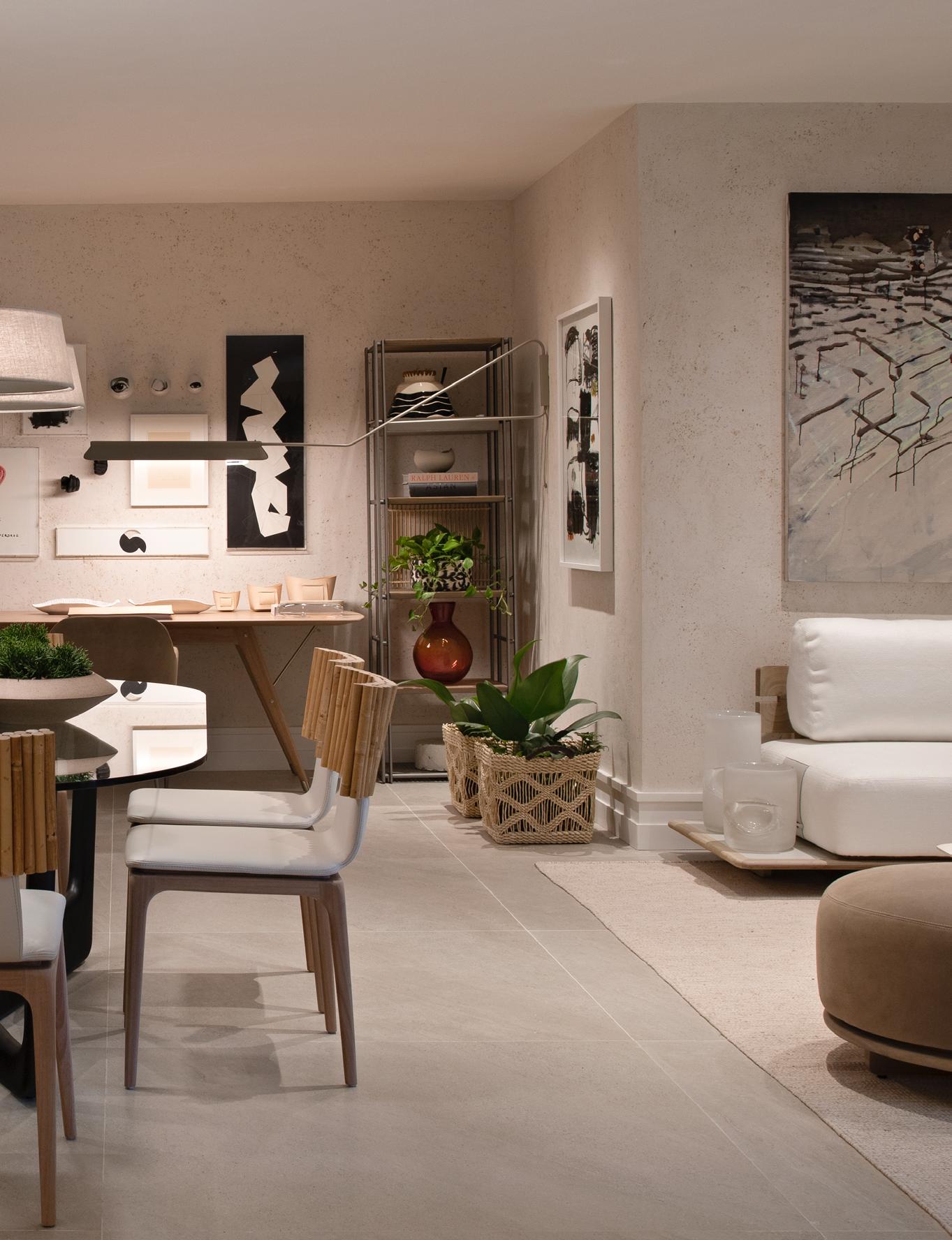 abraça a área do living, e, na área de jantar, a mesa de jantar Minos, em conjunto com as cadeiras Carrie e o aparador Greta. “Felicidade para mim está relacionada à confraternização e ao encontro, por isso investi em um mobiliário mais orgânico e suave. Mais próximo das formas do corpo humano”.