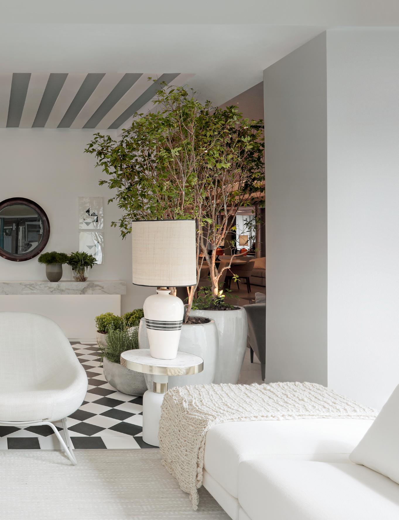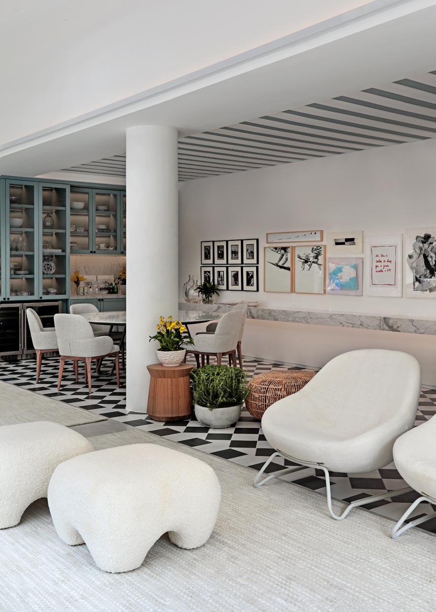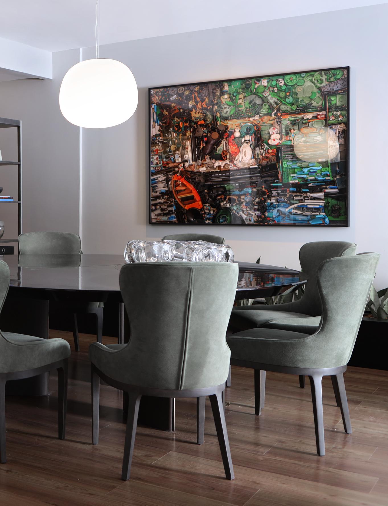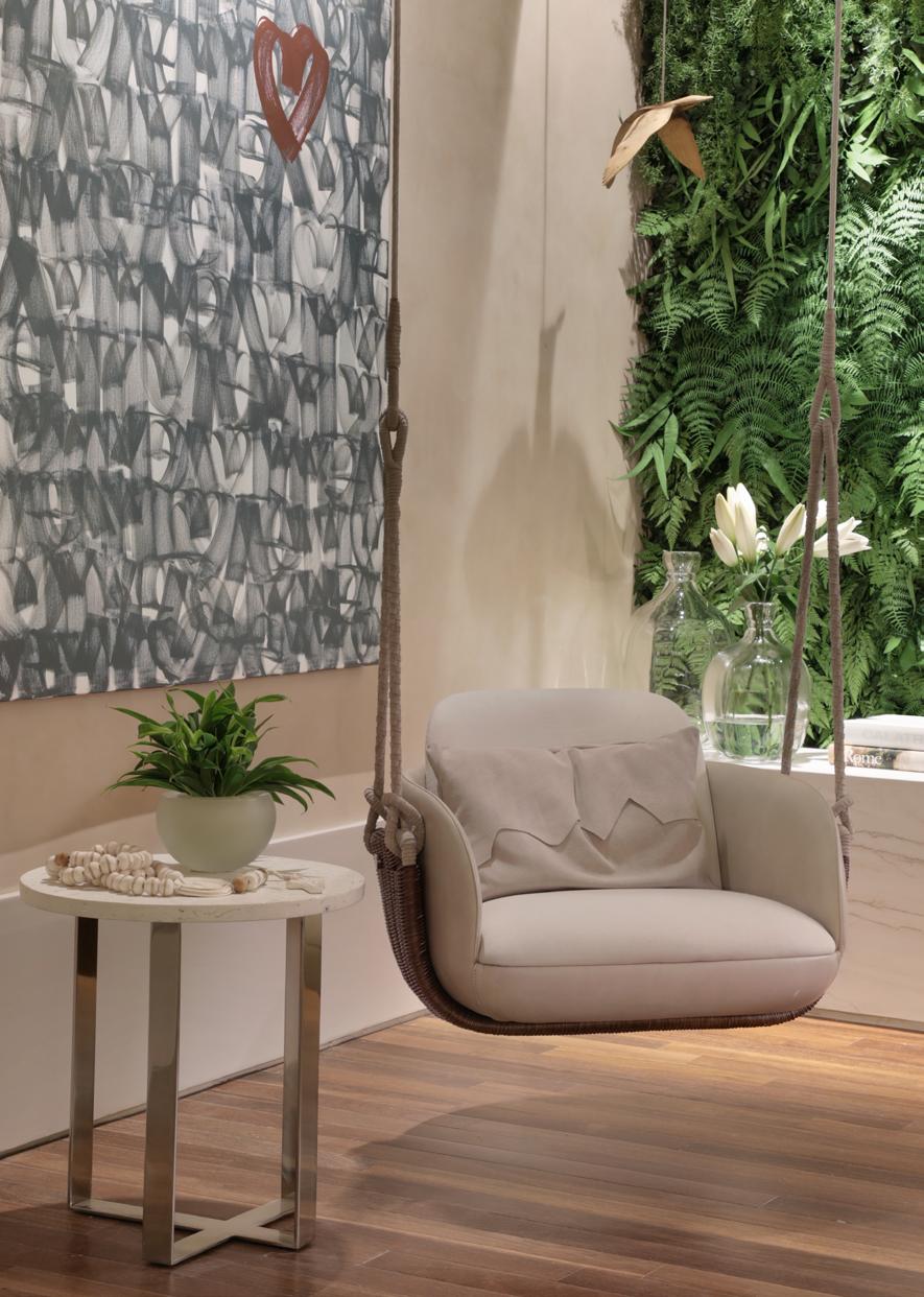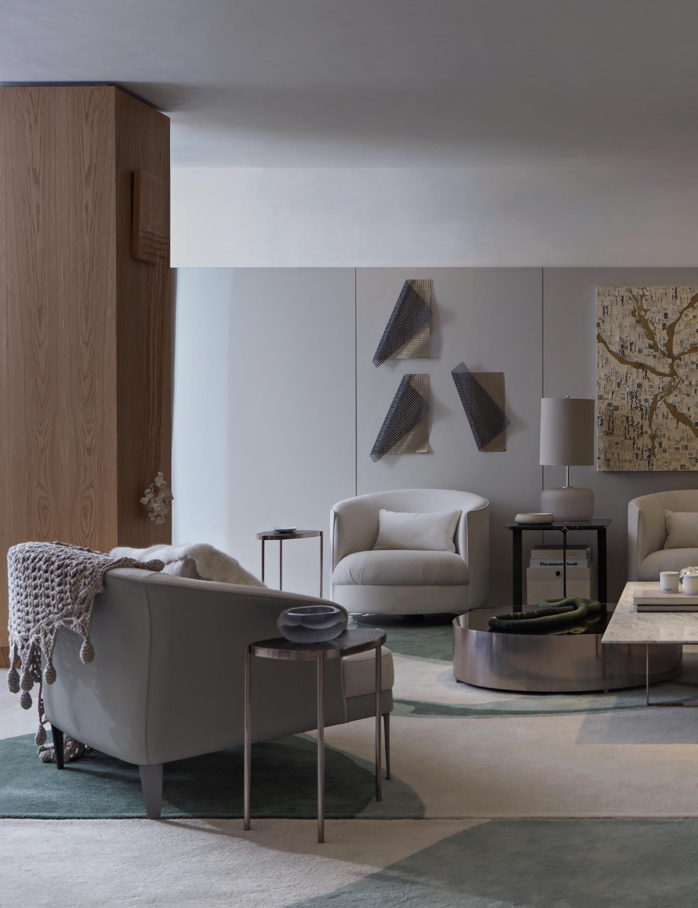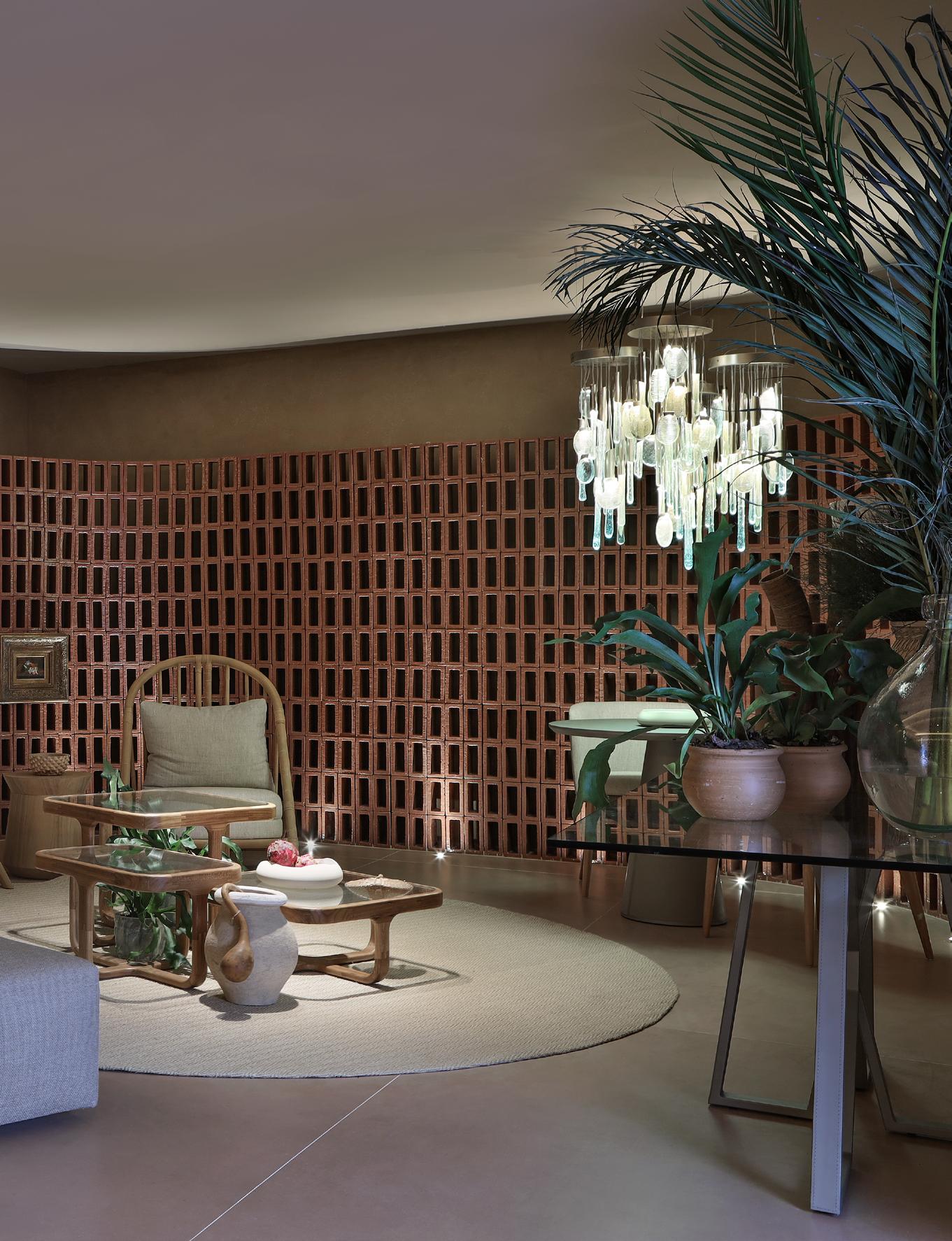 abraça a área do living, e, na área de jantar, a mesa de jantar Minos, em conjunto com as cadeiras Carrie e o aparador Greta. “Felicidade para mim está relacionada à confraternização e ao encontro, por isso investi em um mobiliário mais orgânico e suave. Mais próximo das formas do corpo humano”.