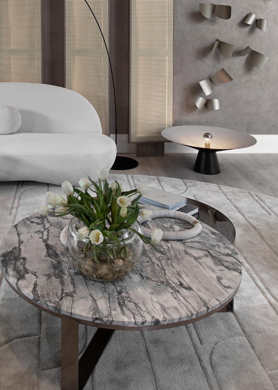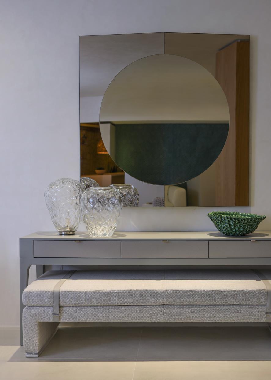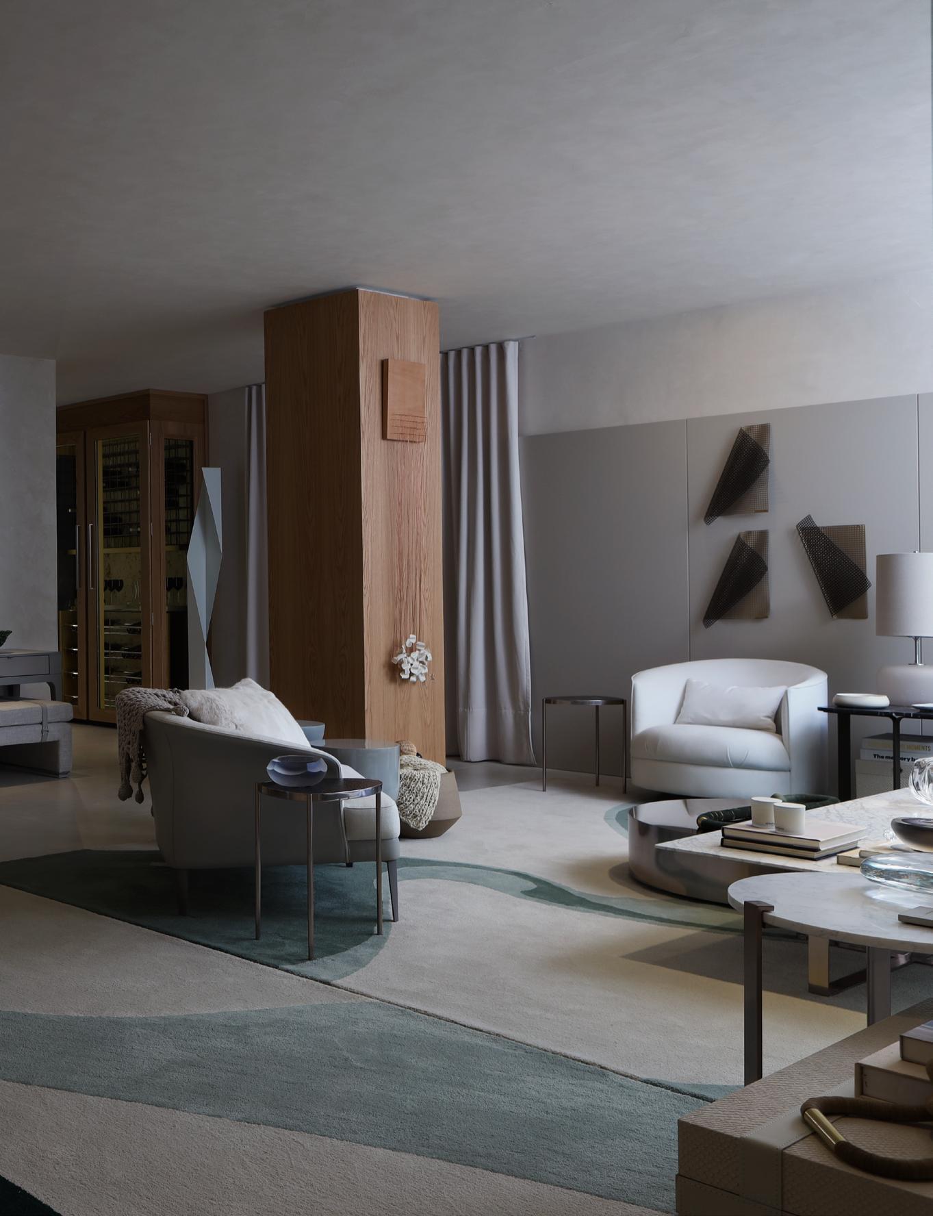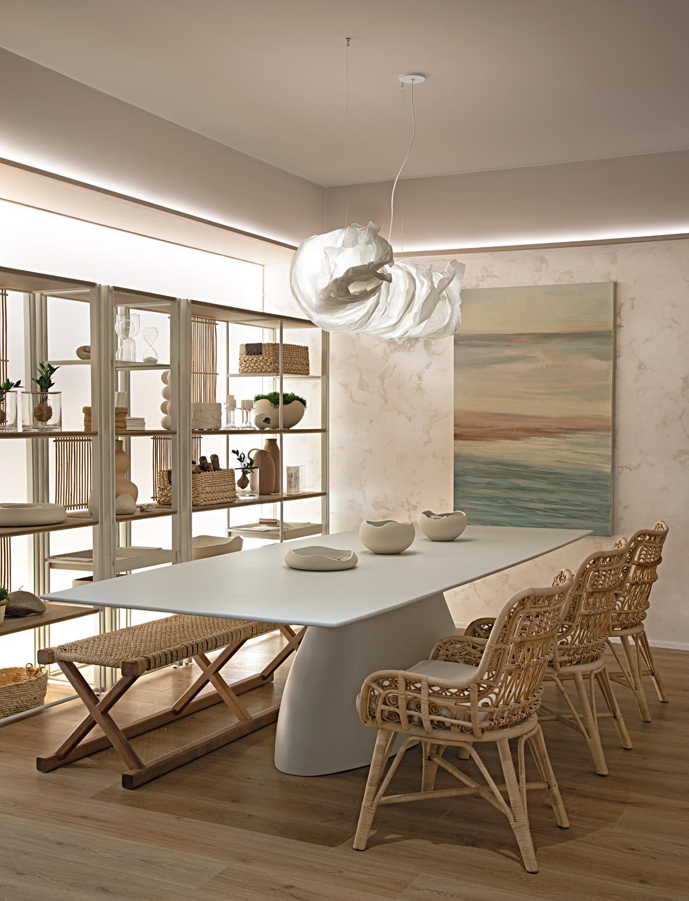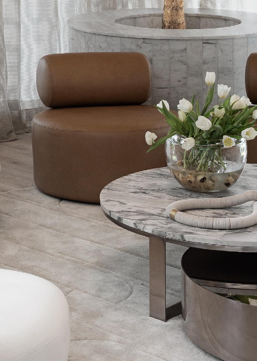 abraça a área do living, e, na área de jantar, a mesa de jantar Minos, em conjunto com as cadeiras Carrie e o aparador Greta. “Felicidade para mim está relacionada à confraternização e ao encontro, por isso investi em um mobiliário mais orgânico e suave. Mais próximo das formas do corpo humano”.